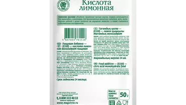 Лимонная кислота является пищевым продуктом и производится из натуральных ингредиентов, она безопасна для использования в кулинарных целях. Это натуральный консервант и регулятор кислотности. Вы можете использовать лимонку для приготовления сока, лимонада, салатов и соусов. Она не заменима при приготовлении выпечки – помогает сохранить свежесть и природный вкус продуктов, а также продлевает срок годности. Страна-производитель Россия