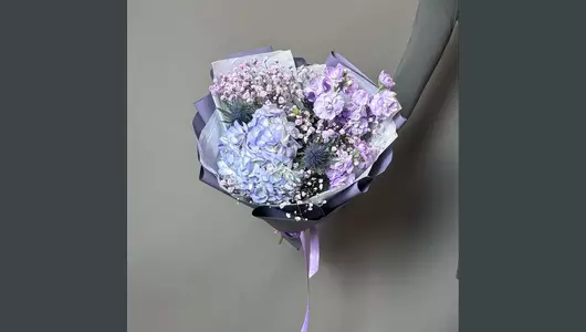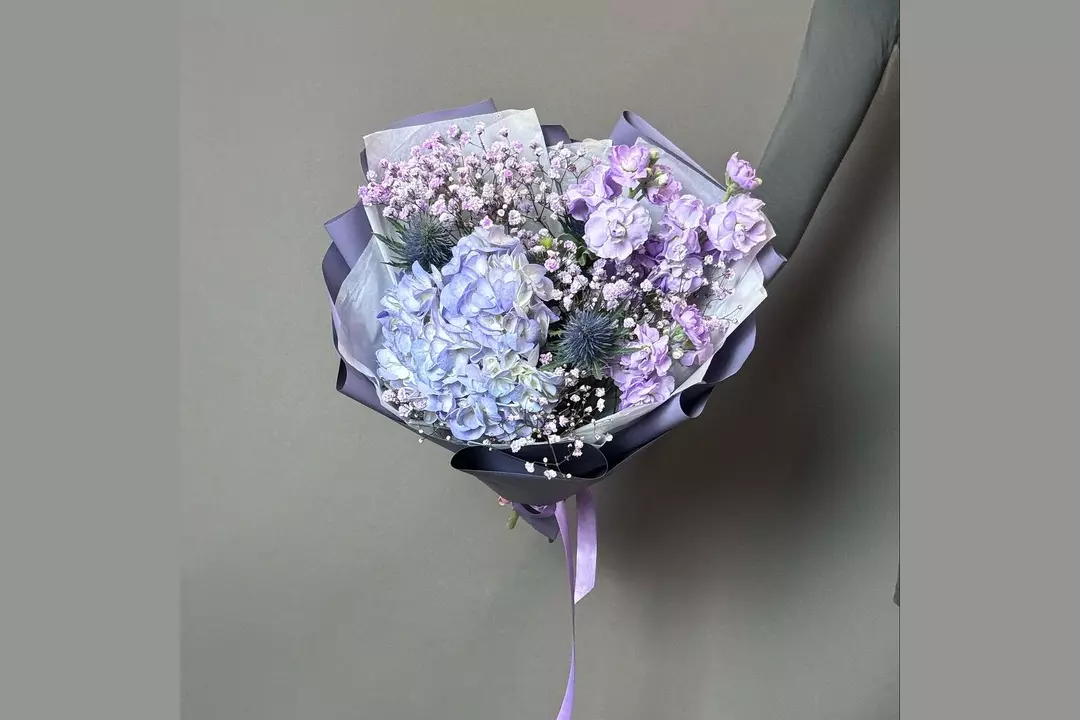 Гипсофила - 2 шт. Гортензия - 1 шт. Эрингиум - 1 шт. Упаковка дизайнерская - 1 шт. маттиола кустовая - 1 шт.
