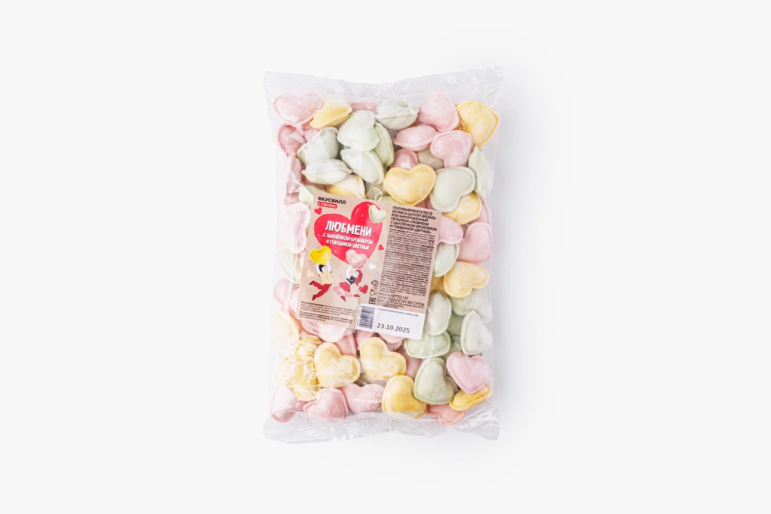 Симпатичные пельмени-сердечки представлены в трёх цветах и будто созданы, чтобы поднимать настроение. А ещё они не только красивые, но и вкусные. Внутри — сочная начинка из цыплёнка и говядины со сливочным маслом и ароматными специями. Лёгкие нотки чёрного перца, кориандра и петрушки делают вкус выразительнее, но без лишней пряности. Тесто окрашено натуральными экстрактами шпината, куркумы и сафлора. Оно не расползается при варке, сохраняя все соки внутри. Не добавляем соевый белок и усилители вкуса. Для подачи можно дополнить любмени сметаной.