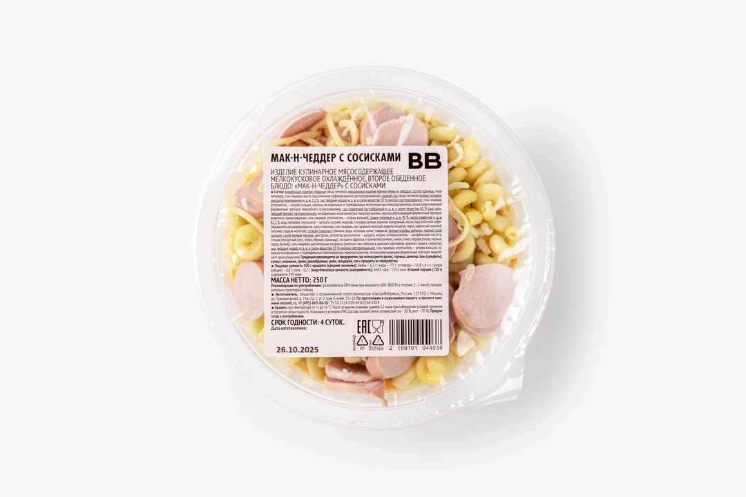 Макароны в густом сырном соусе с сочными свино-говяжьими сосисками с добавлением цельного молока — это привычное сочетание в новой подаче. Чеддер и плавленый сыр обволакивают каждый кусочек и придают блюду лёгкую пикантность. Такая еда поднимет настроение даже в самый хмурый день: просто разогрейте мак-н-чеддер за пару минут и наслаждайтесь знакомым вкусом. Простое блюдо подойдёт для сытного обеда или неспешного ужина за просмотром любимого фильма. Оно порадует тех, кто ценит домашнюю еду без лишней вычурности.