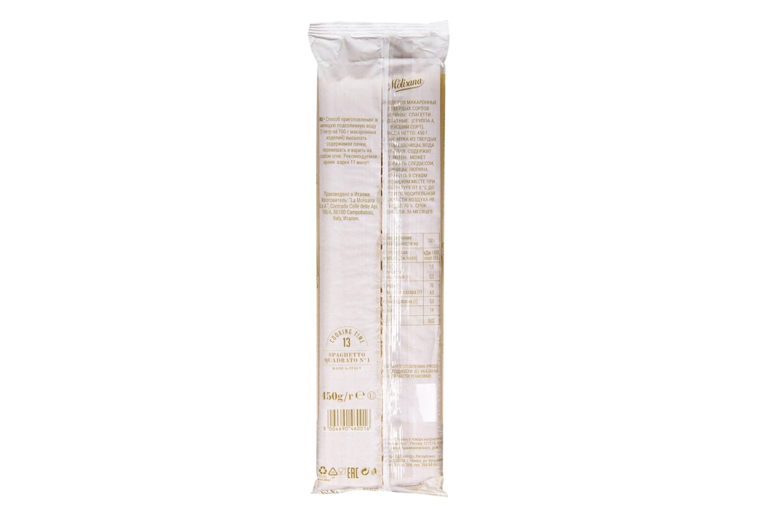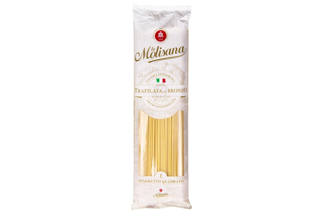 Макаронные изделия La Molisana сделаны из муки твердых сортов, содержащей чуть меньшее количество клейковины, чем обыкновенная мука. Она хорошо поглощает воду, макароны из нее при варке увеличиваются и не развариваются. Макароны La Molisana Spaghetto Quadrato №1 - это оригинальные макаронные изделия, квадратные в поперечном сечении (2*2мм). Они производятся в итальянском регионе Молизе из лучших сортов пшеницы и чистейшей горной воды, которая спускается с вершины горы Матезе. Традиционный способ приготовления Trafilatura al bronzo (продавливание теста через специальные бронзовые формы) делает поверхность пасты шероховатой, благодаря чему она хорошо удерживает соусы. Квадратные спагетти рекомендуется варить 13 минут и подавать с классическими соусами Карбонара, сливочно-грибным, Маринара или Аматричиана. Страна-производитель Италия
