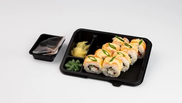 Лакомый ролл с начинкой из японского отварного риса, рубленого слабосоленого лосося, творожного сыра и свежего огурца, покрытый отварными креветками, сдобренный тропическим соусом с легкой пикантностью и перьями зеленого лука. Комплектуется с имбирем маринованным, васаби и соевым соусом.
