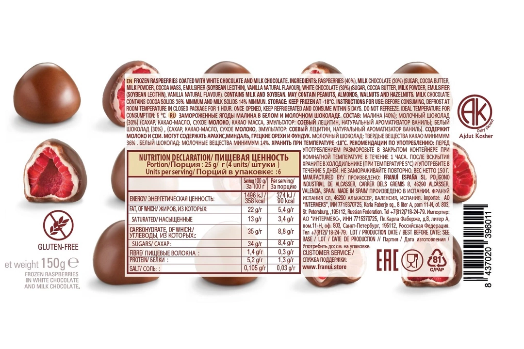 Малина Franui в белом и молочном шоколаде замороженная 150 г / Супермаркет