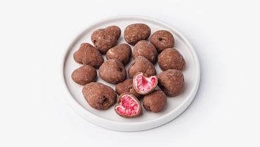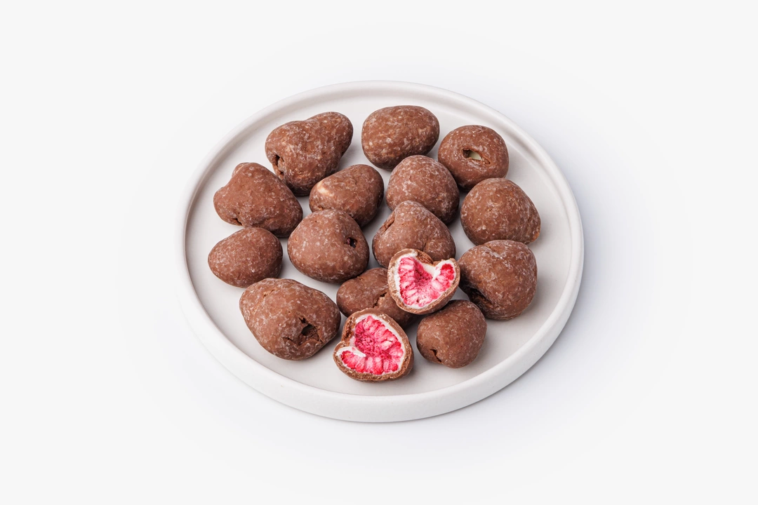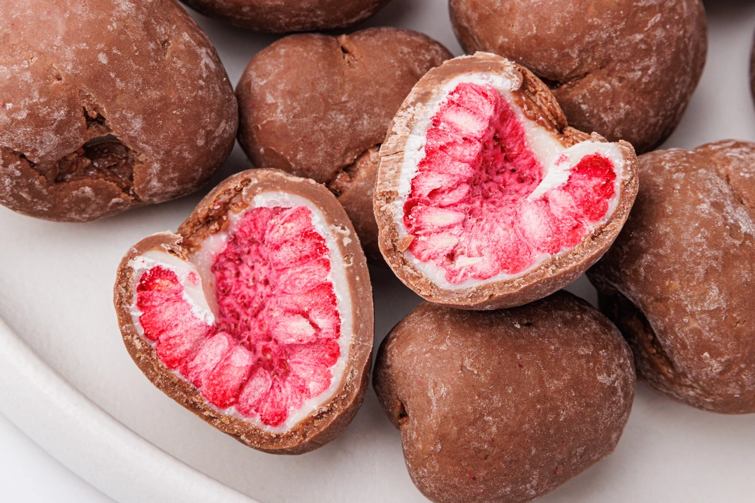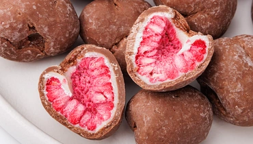Конфеты с сублимированной малиной в белом и молочном шоколаде. Сочетание ягодной кислинки и сливочной сладости создаёт выразительный вкус, который так и хочется распробовать. Десерт можно подать в качестве дополнения к чашке чая или кофе или перекусить им в течение дня. А ещё это оригинальный сладкий комплимент близкому человеку, который обязательно будет оценён по достоинству.
