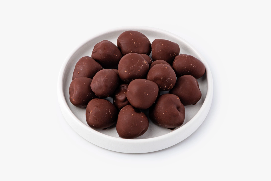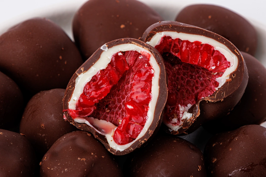 Сочные ягоды малины встречаются с двумя видами шоколада: белым и тёмным. Белый даёт мягкую сливочность, а тёмный добавляет глубину и благородную горчинку. Внутри — свежесть быстрозамороженной малины с ярким ароматом и деликатной кислинкой. За счёт контраста сладкого и ягодного получается выразительное, но не тяжёлое сочетание. Удобный формат — такие ягодки можно подать как мини-десерт к кофе или использовать для украшения мороженого и тортов, когда хочется добавить эффектный акцент.