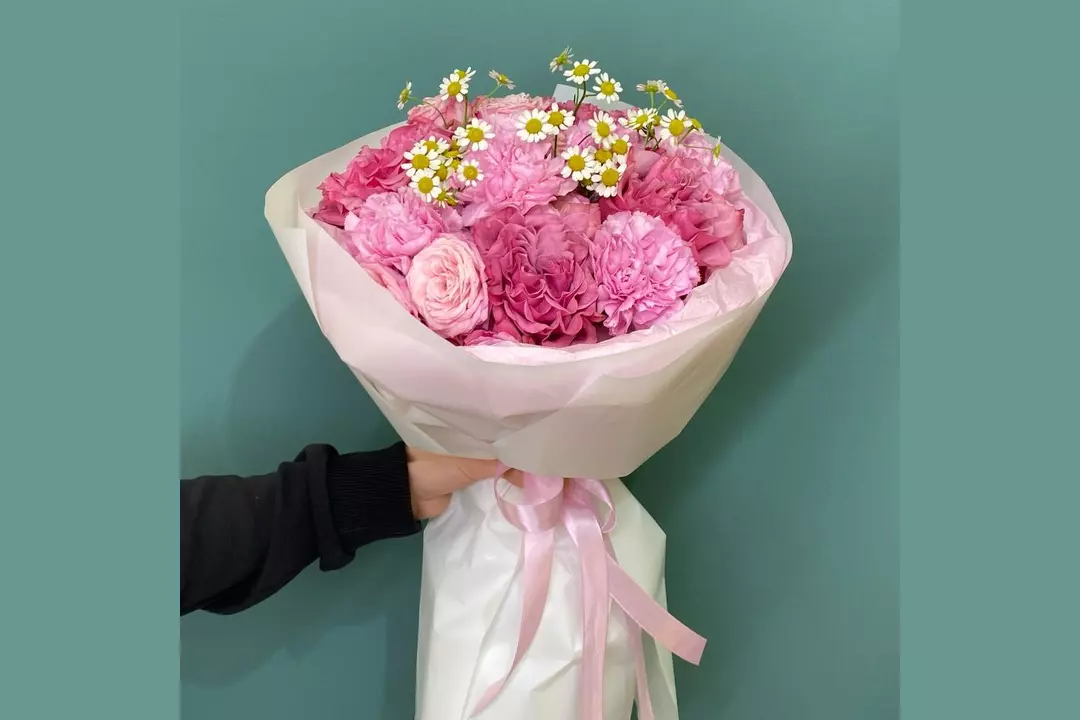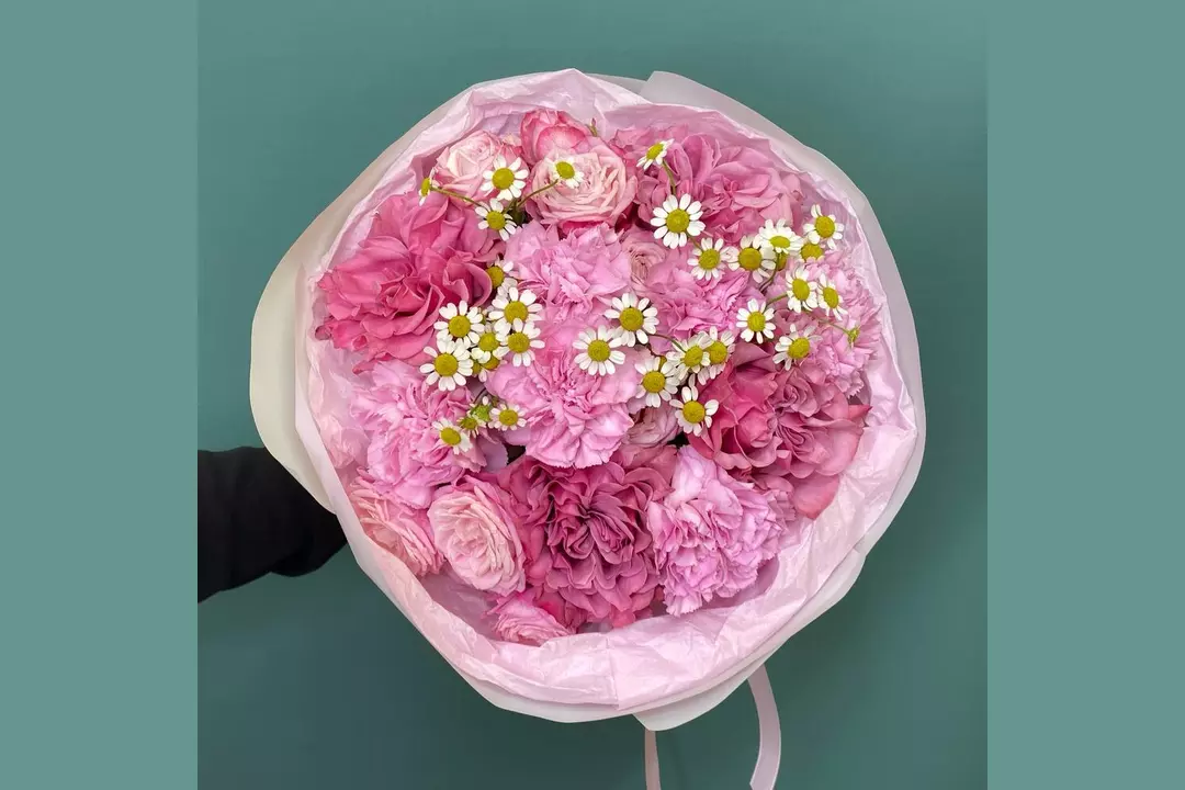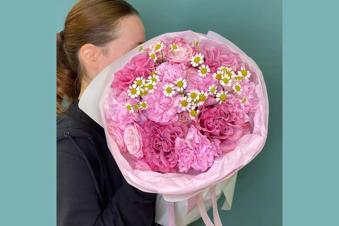 Яркий малиновый букет с пионовидными розами 😍 Состав: Гвоздика - 6 шт. Матрикария - 1 шт. роза кантри блю - 4 шт. роза кустовая леди - 2 шт.