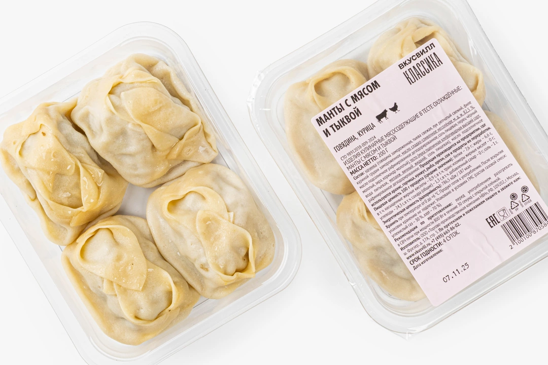 Чтобы манты получились такими вкусными, мы соединили сочную говядину с нежным куриным филе. Дополнили начинку кусочками сладкой тыквы и щепоткой традиционных пряностей. А затем завернули всё в эластичное, тонко раскатанное тесто и отварили на пару. Приготовили с заботой: без соевого белка, ароматизаторов и консервантов.
