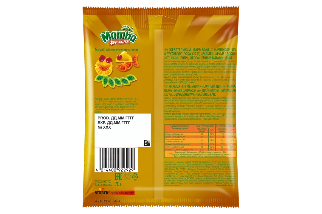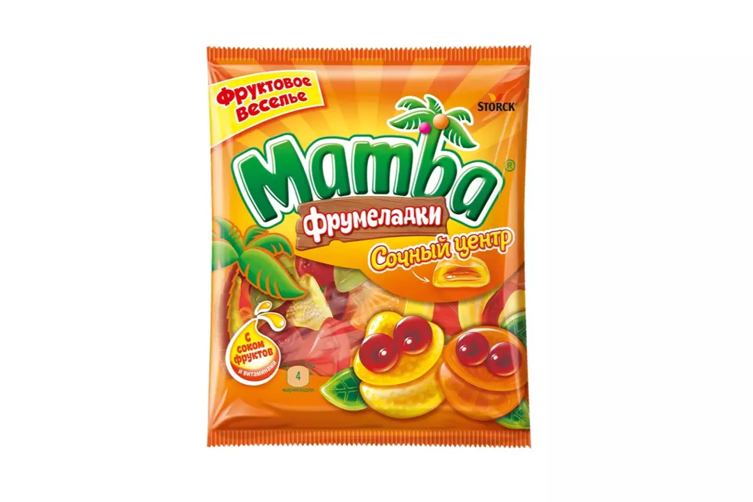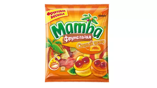 Mamba Фрумеладки - вкусные жевательные мармеладки c фруктовым соком и витаминами! Насладись отличным вкусом и получи заряд веселья и прекрасного настроения! А самое интересное – ты можешь с ними играть! Создай свой мир фруктовых героев Mamba Фрумеладки, складывая мармеладки различных форм и превращая их в новых веселых персонажей. Собери свою команду героев с острова Mamba! Mamba Фрумеладки «Сочный центр» - жевательный мармелад с начинкой из фруктового сока (22%), обогащенный витаминами.