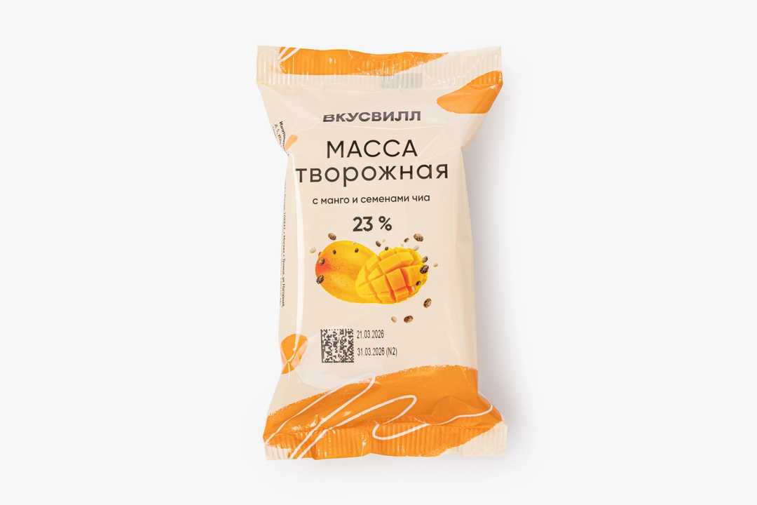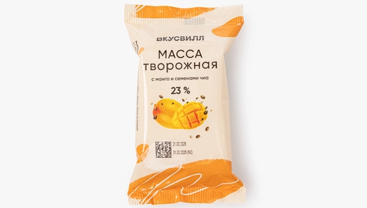 Творожная масса приготовлена из натурального творога с кусочками манго. Текстура мягкая, с приятным контрастом благодаря добавлению семян чиа. Вкус сливочный, с яркими фруктовыми нотами и лёгким ореховым оттенком. Это готовый вариант для завтрака, полдника или перекуса в течение дня. Массовая доля жира 23%