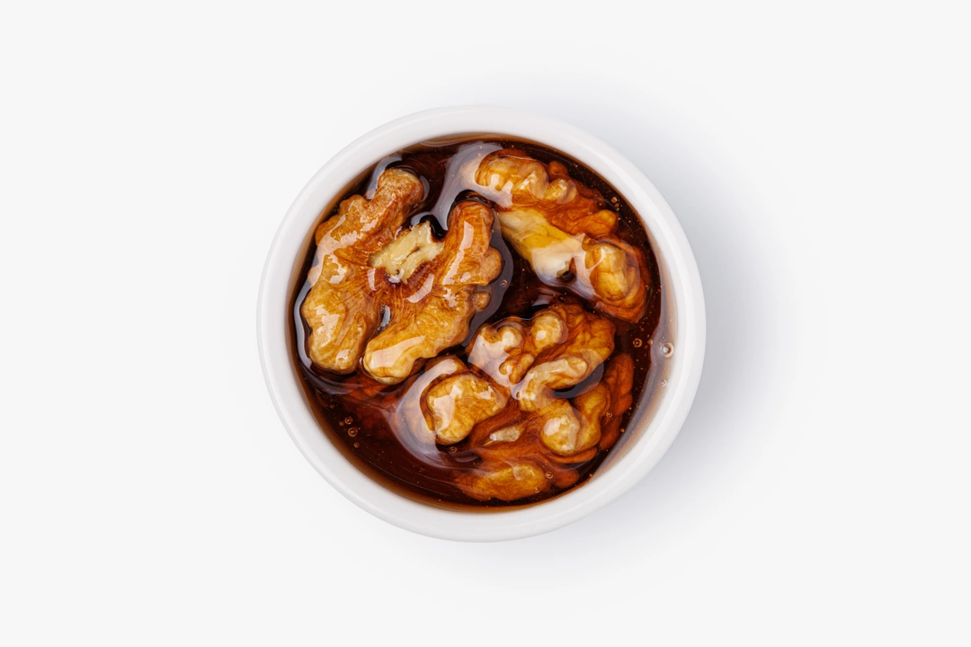 Цветочный мёд с дроблёными ядрами грецкого ореха — это классическое десертное сочетание. Сладкая и тягучая основа мягко обволакивает кусочки ореха, подчёркивая их лёгкую горчинку. Вкус получается сбалансированным и очень насыщенным. Лакомство подойдёт для утренних тостов или творожных завтраков, его можно использовать как натуральную добавку к каше или основу для домашней выпечки.