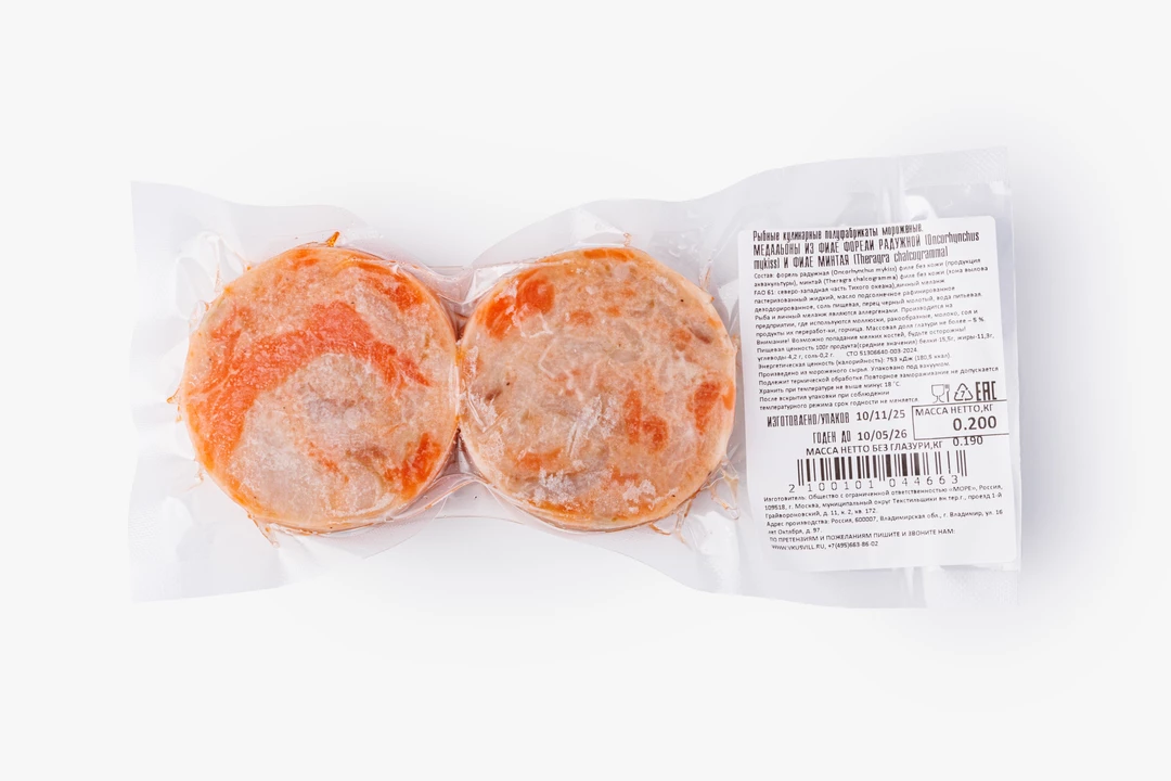 Аппетитные медальоны приготовлены из филе радужной форели и минтая. Добавили яйцо, чтобы они лучше держали форму, и деликатно подчеркнули вкус щепоткой соли с перцем. Предварительная разморозка не требуется — просто обжарьте на разогретой сковороде с обеих сторон до румяной корочки. Яркий вкус подчеркнут соусы на основе сливок или заправка из лимона и пряных трав. Подходят для лёгкого ужина с овощами.