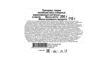 Мидии по количеству белка превосходят говядину и рыбу. В них много минеральных солей, витаминов группы В, витамина D и Е, а также фосфора и железа. Отличается мясо этих моллюсков высоким содержанием полиненасыщенных жирных кислот. Номинальная масса - 200 г Масса основного продукта 100 г Страна производитель-Россия