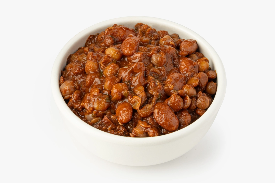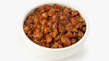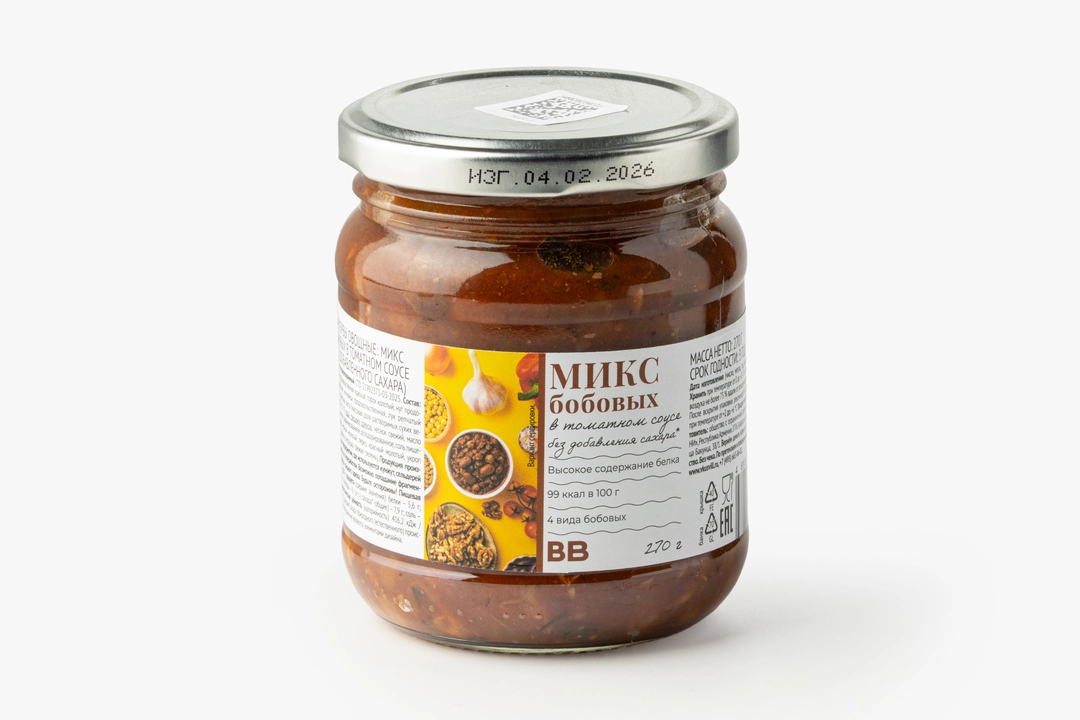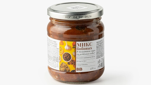 Яркая закуска приготовлена из четырёх видов бобовых в насыщенном томатном соусе. Продукт не содержит сахар, у него натуральный вкус с лёгкой кислинкой. Грецкие орехи добавляют блюду деликатную терпкость, а зелень и чеснок — свежесть и остроту. Благодаря высокому содержанию белка и невысокой калорийности из него получается сытный гарнир, аппетитное дополнение к мясу и птице, а также густая основа для супа.