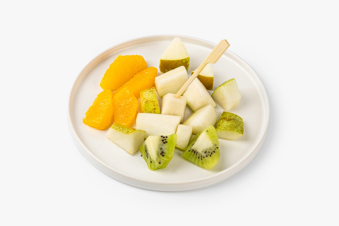 Свежий микс из сочных долек груши, ароматного апельсина и нежного киви. Сочетание разных текстур и вкусов создаёт освежающий гармоничный вкус. Фрукты уже очищены, нарезаны и готовы к употреблению. Подходят для лёгкого перекуса, украшения десертов или в качестве добавки к утренней каше.
