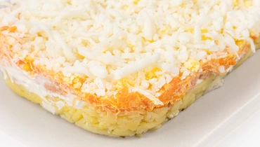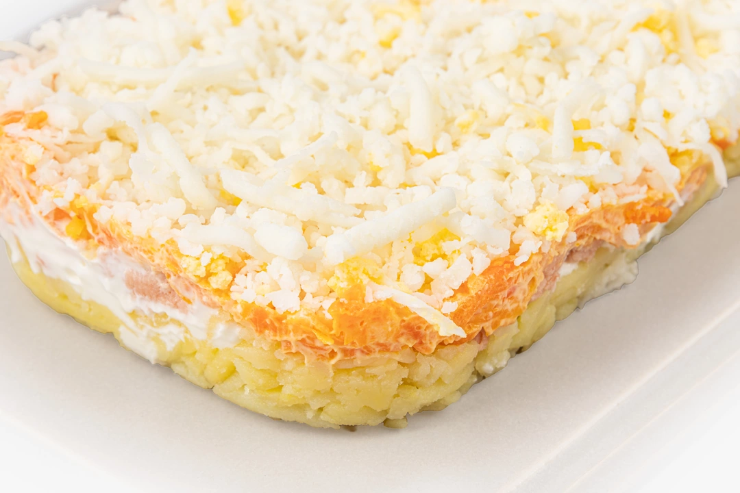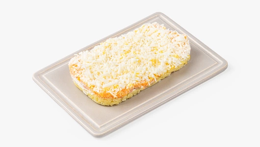 Пикантная и очень аппетитная версия культового весеннего салата «Мимоза». Бархатистый вкус солнечного яичного желтка, отварного картофеля и сладковатой моркови. Морской, солоноватый и чуть дымный аромат лосося горячего копчения. Маслянисто-пряный домашний майонез добавляет салату нежности. Может стать и превосходной закуской, и полноценным вторым блюдом — лёгким, но сытным.