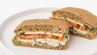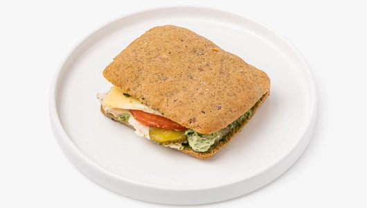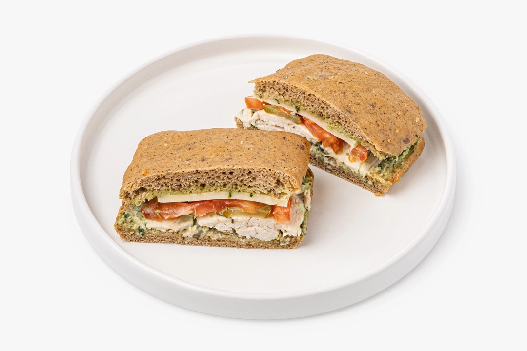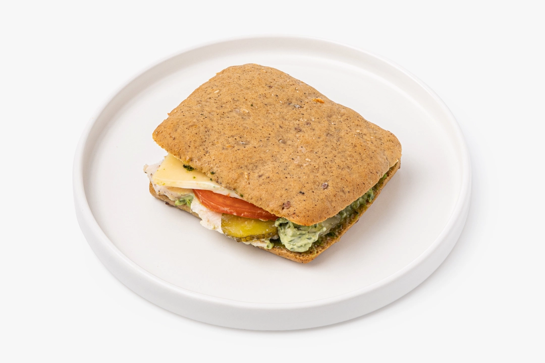 Сэндвич с запечённой индейкой, сыром и овощами — это вариант для быстрого обеда или сытного перекуса в течение дня. Мы выпекли чиабатту из ржано-пшеничной муки с добавлением семян льна, кунжута и подсолнечника. Внутрь положили начинку из нежного филе индейки, свежего томата и солёного огурца и приправили соусом песто с кешью и базиликом. Добавили майонез для мягкости, а сыр — для придания вкусу сливочного оттенка. Рекомендуем перед употреблением слегка подогреть, чтобы сыр расплавился, а мясо пропиталось ароматным соусом