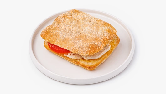 Пышная мини-чиабатта, начинённая пряной печёной курочкой, тающей моцареллой и ломтиком томата. Разбавили нежную палитру пикантным чили-соусом — остроты в нём ровно столько, чтобы во рту приятно покалывало, но не жгло. Товар доступен с доставкой и в магазинах с зоной кафе.