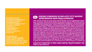 Мини-пицца «Карбонара» от бренда «Мираторг» — замороженный продукт в формате мини-пиццы, созданный по мотивам классического итальянского блюда. Страна-производитель Россия
