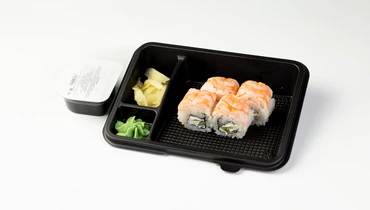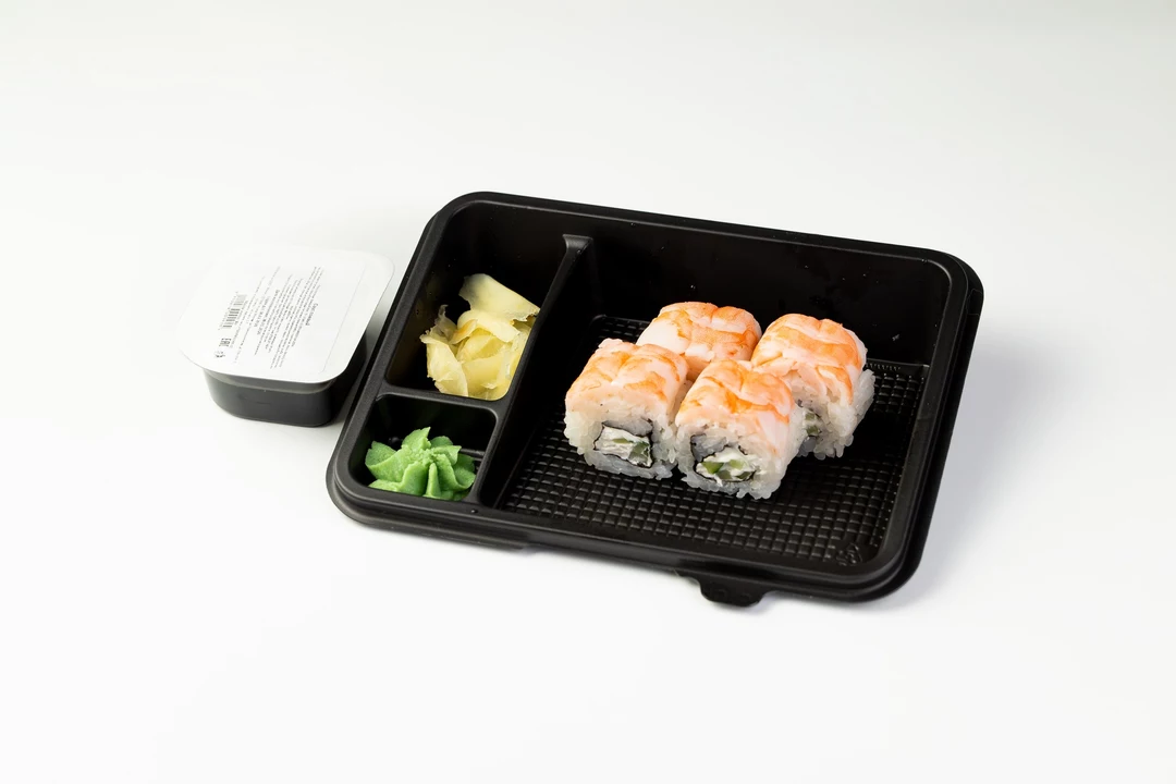 Четыре аккуратных кусочка для тех, кто предпочитает морепродукты в чистом виде. Снаружи ролл обернут слайсами отварной тигровой креветки с её характерным, чуть сладковатым вкусом. Внутри — плотный слой сливочного сыра и соломка свежего огурца, которые добавляют роллу мягкость и сочность. Это простое и понятное сочетание ингредиентов, которое отлично подходит для легкого, но сытного перекуса. В комплекте — классическое трио: маринованный имбирь, острый васаби и натуральный соевый соус.