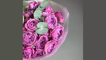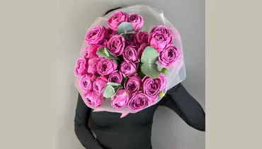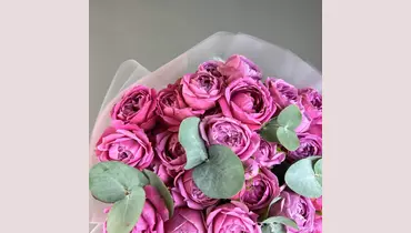 Эвкалипт - 5 шт. Роза кустовая пионовидная - 15 шт. Упаковка дизайнерская - 1 шт.