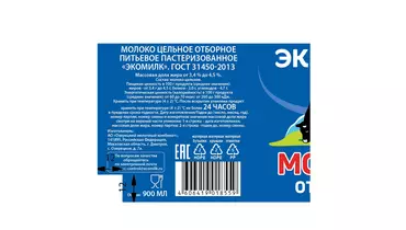 Молоко Экомилк цельное пастеризованное 3,4% - 4,5% 900 г / Супермаркет