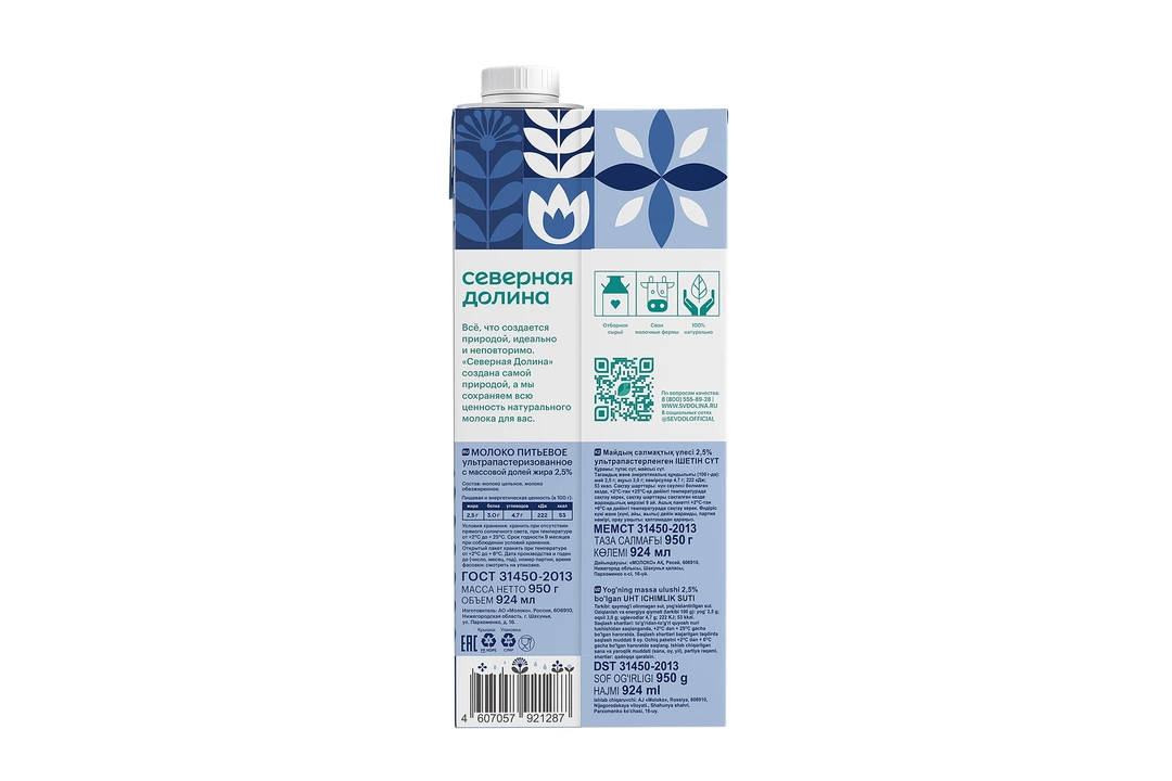 Молоко Северная Долина ультрапастеризованное 2,5% 950 г / Супермаркет