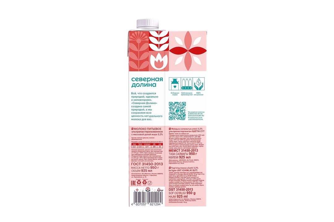 Молоко Северная Долина ультрапастеризованное 3,2% 950 г / Супермаркет