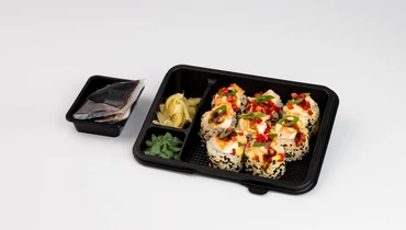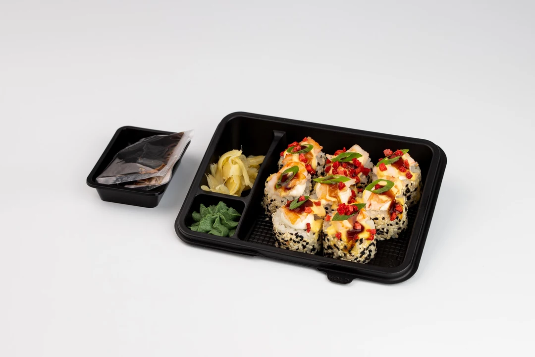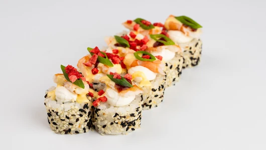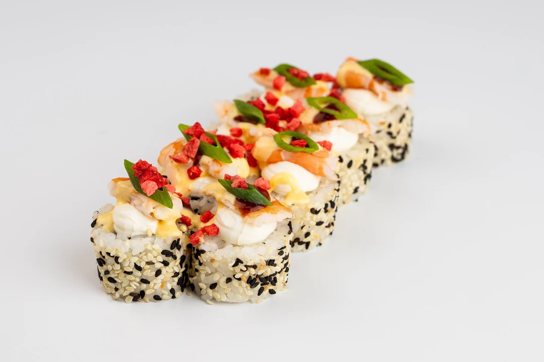 Этот ролл — истинное воплощение гастрономического контраста и изысканности. В его основе лежит классический дуэт премиального японского риса и хрустящего нори, скрывающий нежную сердцевину из сливочного творожного сыра и освежающего слайса свежего огурца. Снаружи ролл щедро обвалян в пестрой смеси черного и белого кунжута, что придает ему приятную текстуру и легкий ореховый аромат. На каждом кусочке возвышается эффектная «шапка» из воздушного творожного сыра и сочных ломтиков отварных тигровых креветок. Завершающий штрих — благородный глянцевый соус унаги, поверх которого рассыпаны рисовые шарики, кислинки сублимированной клубники и пряных перьев свежего зеленого лука. Это невероятное сочетание текстур и вкусов, от нежно-сливочного до сладко-соленого, подарит вам незабываемое удовольствие.