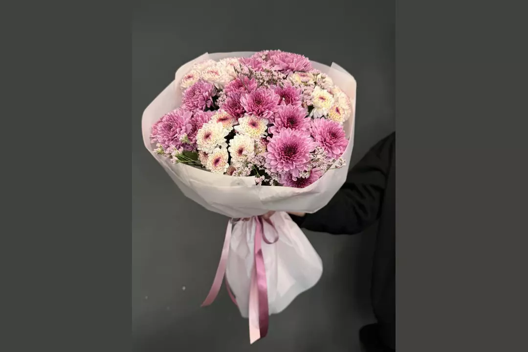 Этот букет — воплощение нежности и утончённости. В нём гармонично сочетаются кустовые хризантемы розовых и белых оттенков.