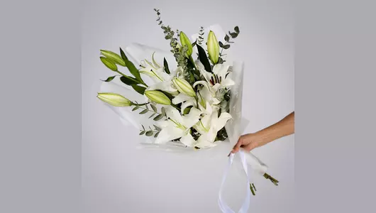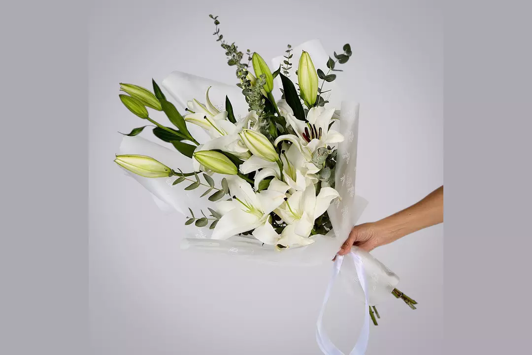 Монобукет из белых лилий с эвкалиптом — это гармоничное сочетание, где чистота белых лилий и выразительная зелень эвкалипта соединяются во флористическом дуэте, подчеркивающем лёгкость, свежесть и стиль оформления. Форма цветов изящна и полна движения — бутоны словно тянутся к свету, а открытые лилии раскрывают всю глубину белого оттенка. Этот букет привлекает внимание и придаёт своему окружению особую энергетику нежности и гармонии. Даже в простой обстановке монобукет добавит эмоциональный тон — умиротворит атмосферу и подарит вдохновение. Белая лилия традиционно символизирует благородство, а эвкалипт приносит ощущение нового начала и чистоты мыслей. Букет станет не только украшением, но и напоминанием о светлых чувствах, которые хочется сохранить.