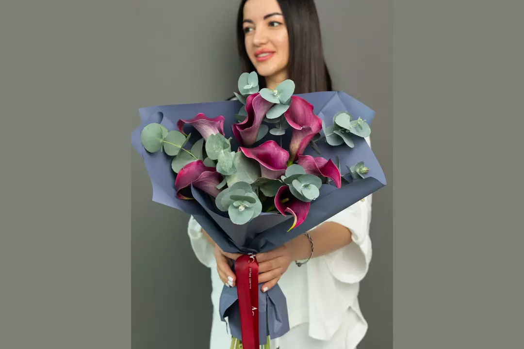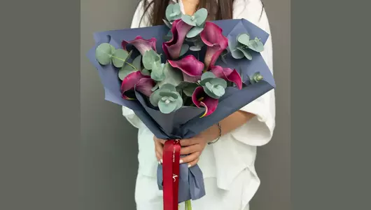 Этот изысканный букет, составленный из элегантных калл и благородного эвкалипта, — универсальный подарок, подходящий для любого случая. Независимо от того, поздравляете ли вы с юбилеем, выражаете сочувствие или просто хотите порадовать близкого человека, этот букет станет прекрасным выбором, носящим в себе тонкое очарование и непреходящую красоту. Строгая красота калл, с их уникальной формой и богатой текстурой, создаёт ощущение стиля и изящества. Тонкие, изящные линии цветков гармонично сочетаются с ароматной зеленью эвкалипта, добавляя композиции свежести и легкости. Это сочетание создает гармоничный ансамбль, который привлечет внимание своей утонченностью и особой атмосферой. Букет прекрасно подойдет как для солидного офиса, так и для уютного домашнего интерьера. Его сдержанная роскошь не перегружает пространство, а наоборот, становится изысканным акцентом, притягивающим взгляд. Он не требует сложных дополнений, его красота сама по себе завораживает и оставляет незабываемое впечатление. А благодаря нашей быстрой доставке, вы можете порадовать своих близких этим прекрасным подарком в любой момент. Независимо от географического положения получателя, мы доставим букет свежим и в идеальном состоянии, в указанные вами сроки. Пусть этот букет станет ярким выражением ваших чувств и внимания. Закажите его прямо сейчас и порадуйте близких незабываемым подарком!