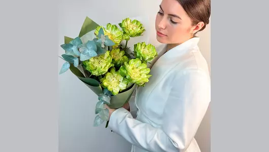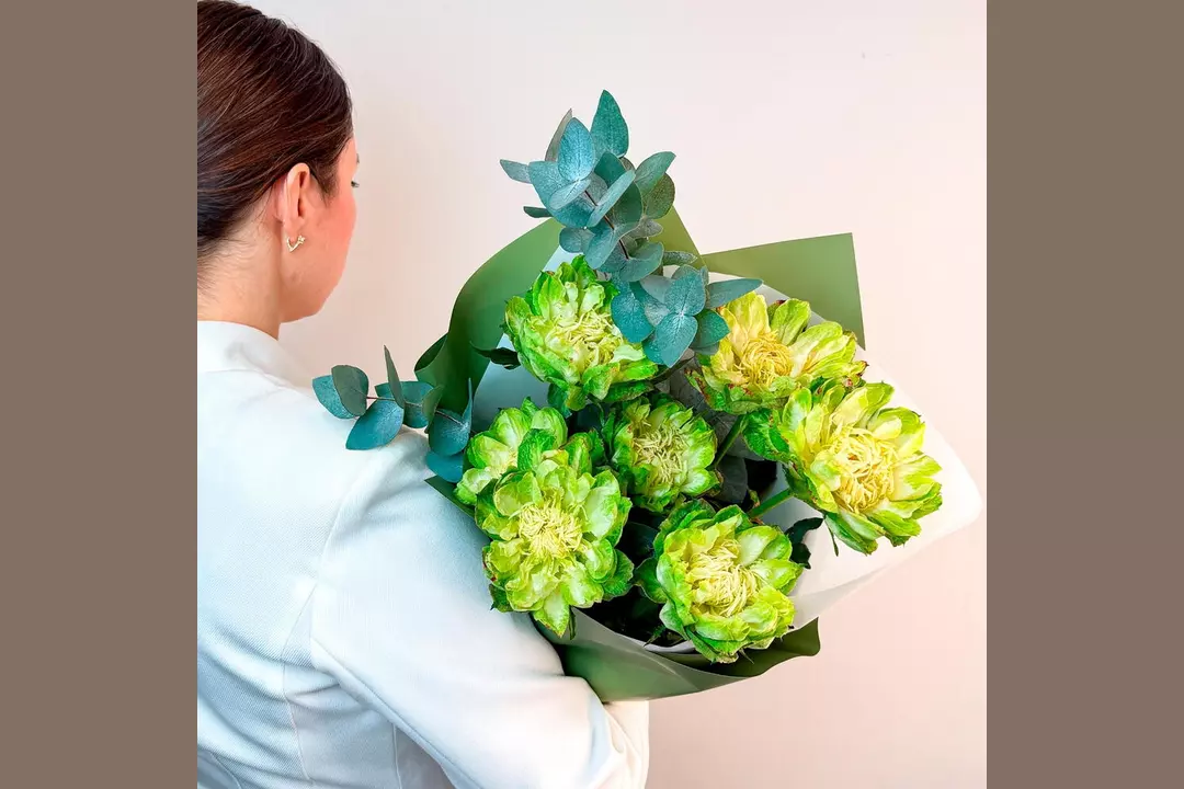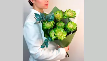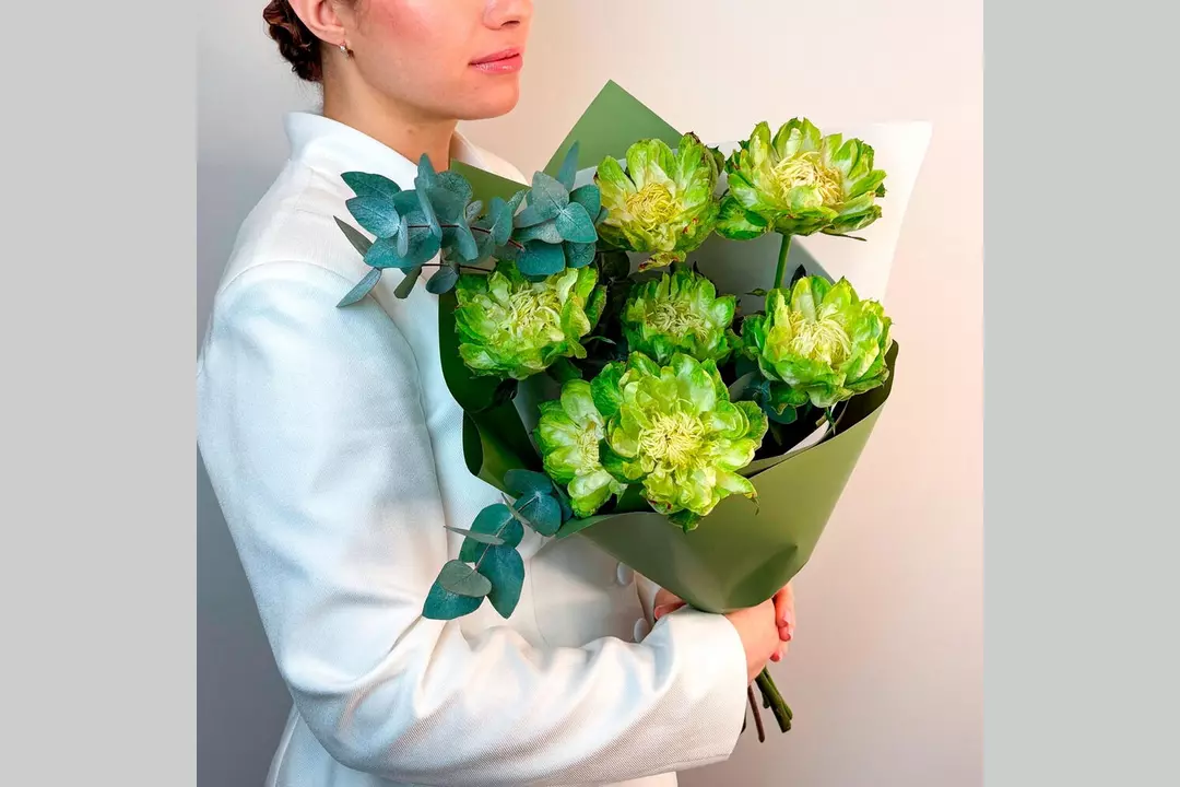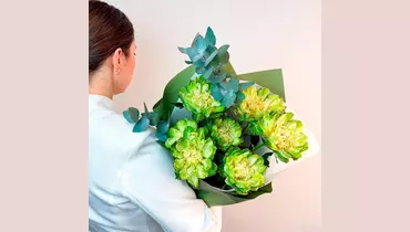 Этот букет — правильный ответ на вопрос «какие цветы заказать». Яркий, свежий и фотогеничный, он станет отличным подарком на любой праздник и просто так, без повода. 🌷 Чтобы цветы радовали как можно дольше 🌷: * Обновите срез секатором или острым ножом на 1 см под углом 45 градусов. * Поставьте цветы в отстоянную воду комнатной температуры. * Меняйте воду каждый день и обновляйте срез раз в 1–2 дня. * Убирайте нижние листья, чтобы они не касались воды. * Срезайте увядшие бутоны. * Держите цветы подальше от фруктов, сквозняков, прямых солнечных лучей, источников тепла (батареи, настольные лампы, кипящий чайник). Состав Лента - 1 шт. Эвкалипт - 1 шт. Фисташка - 1 шт. Упаковка дизайнерская - 1 шт. Роза вегги - 7 шт.