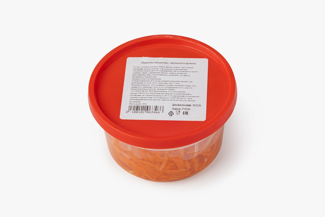 Сочная квашеная морковь в необычном рассоле с кисло-сладкими нотами яблока и пряной остротой хрена. Яблоки придают закуске естественную фруктовую сладость, которая смягчает солоноватую основу, а хрен и чеснок добавляют пикантность. Закуска хороша как самостоятельное блюдо или дополнение к мясу и птице. Она особенно удачно сочетается с гарнирами из отварного картофеля и тушёных овощей. Натуральный состав без уксуса напоминает домашние заготовки из погреба.