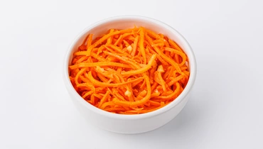 Морковь нарезана тонкой соломкой и заправлена смесью чеснока, кориандра и красного чили. Вкус получается ярким и пряным, в нём острота специй уравновешена лёгкой кислинкой. Масло делает текстуру мягче и связывает все компоненты. А добавленного сахара в составе нет. Такой салат подойдёт к мясу, птице или как самостоятельная закуска.
