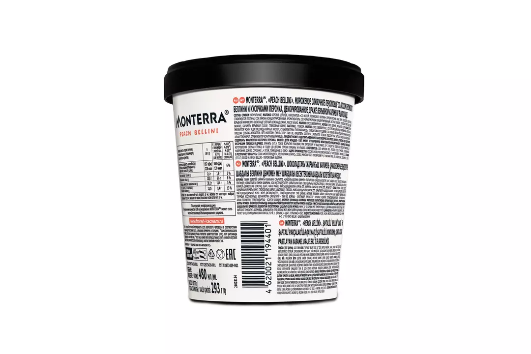 Откройте для себя вкус сезона! Представляем новинку в коллекции вкусов мороженого Monterra — Персиковый Беллини! Monterra Персиковый Беллини (Monterra Peach Bellini) - это десерт, вдохновленный знаменитым классическим коктейлем. В каждой ложечке вы ощутите три грани совершенства вкуса: Нежнейший пломбир из отборных натуральных сливок; Взрывная карамель в белом шоколаде — пузырьки вкуса, создающие неповторимую текстуру, словно игристое в десерте; Яркий персик — кусочки спелого персика и персиковый сок создают неповторимый вкус и аромат. Масса нетто 293 г. Объем 480 мл. Продукт не содержит алкоголя. Страна-производитель Россия.