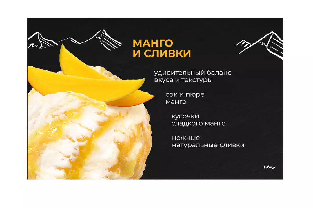 Манго и сливки - роскошный вкус освежающего сорбета манго, окутанного нежным сливочным мороженым. Удивительный баланс вкуса и текстуры, который стоит попробовать.Изысканное сочетание кусочков сладкого спелого манго и нежных натуральных сливок дают удивительный баланс вкуса и текстуры. Масса нетто 281 г