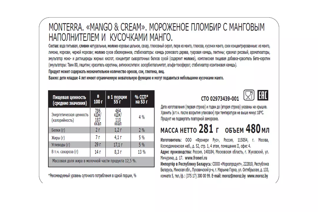 Мороженое Monterra Манго Сливки 480 мл / Супермаркет