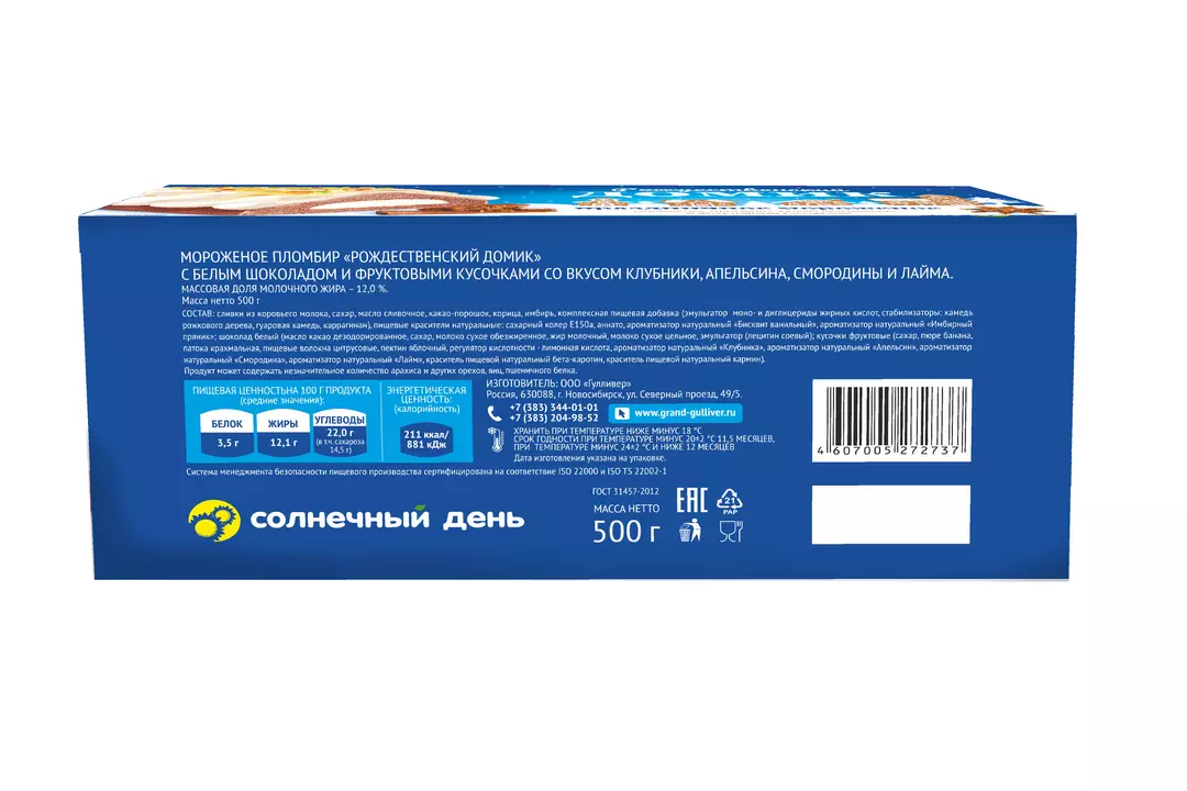 Мороженое Солнечный день пломбир Рождественский домик с шоколадом и фруктовыми кусочками 500 г / Супермаркет