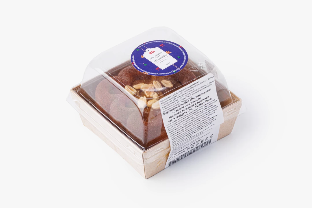 Замороженный десерт на основе традиционного пломбира с классическим пралине. Нежное мороженое из цельного и сгущённого молока дополняют арахисовая начинка и солёная карамель. Покрытие из тёмного шоколада добавляет лакомству лёгкую горчинку, которая ещё ярче подчёркивает ореховые ноты. Такой торт хорош для кофейной паузы или как завершение праздничного ужина. Массовая доля жира в молочной части продукта составляет 15%.