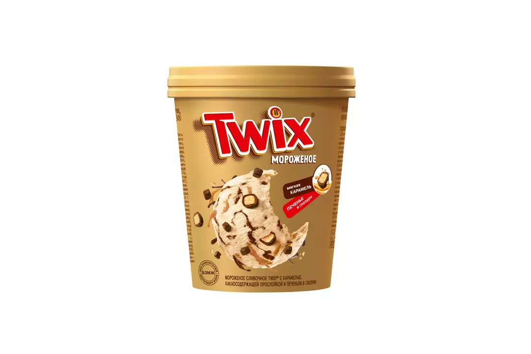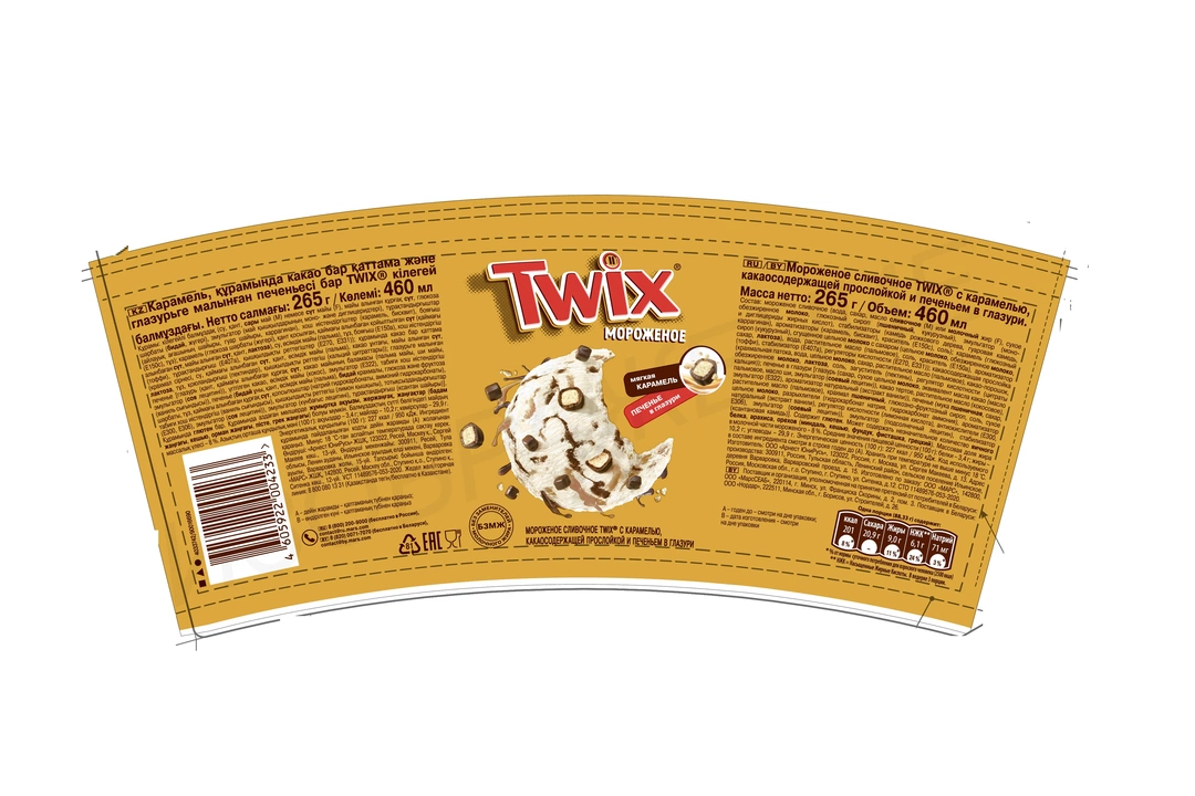 Мороженое сливочное TWIX® с карамелью, какаосодержащей прослойкой и печеньем в глазури. Масса нетто - 265 г Объем -460 мл Страна-производитель Россия