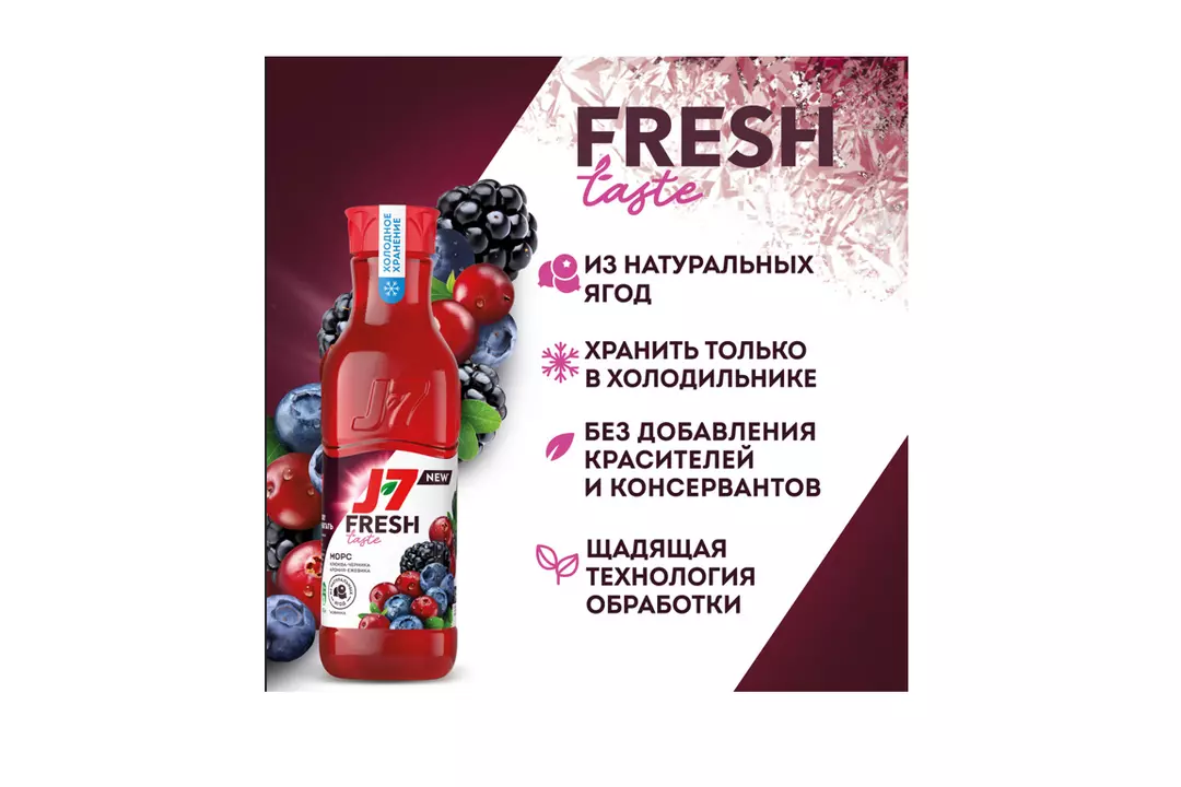 Новинка! Морс J7 Fresh Taste из клюквы, черники, черноплодной рябины и ежевики. Произведен из натуральных ягод по щадящей технологии обработки. Хранить в холодильнике. Зарядись энергией и вкусом ягод вместе с J7! J7 Fresh Taste из клюквы, черники, аронии и ежевики это – ● Морс из натуральных ягод ● Щадящая технология обработки ● Содержит соки клюквы, черники, черноплодной рябины и пюре ежевики ● Без красителей и консервантов ● Перерабатываемая упаковка ● Пастеризованный Страна производитель-Россия