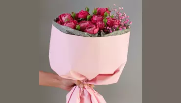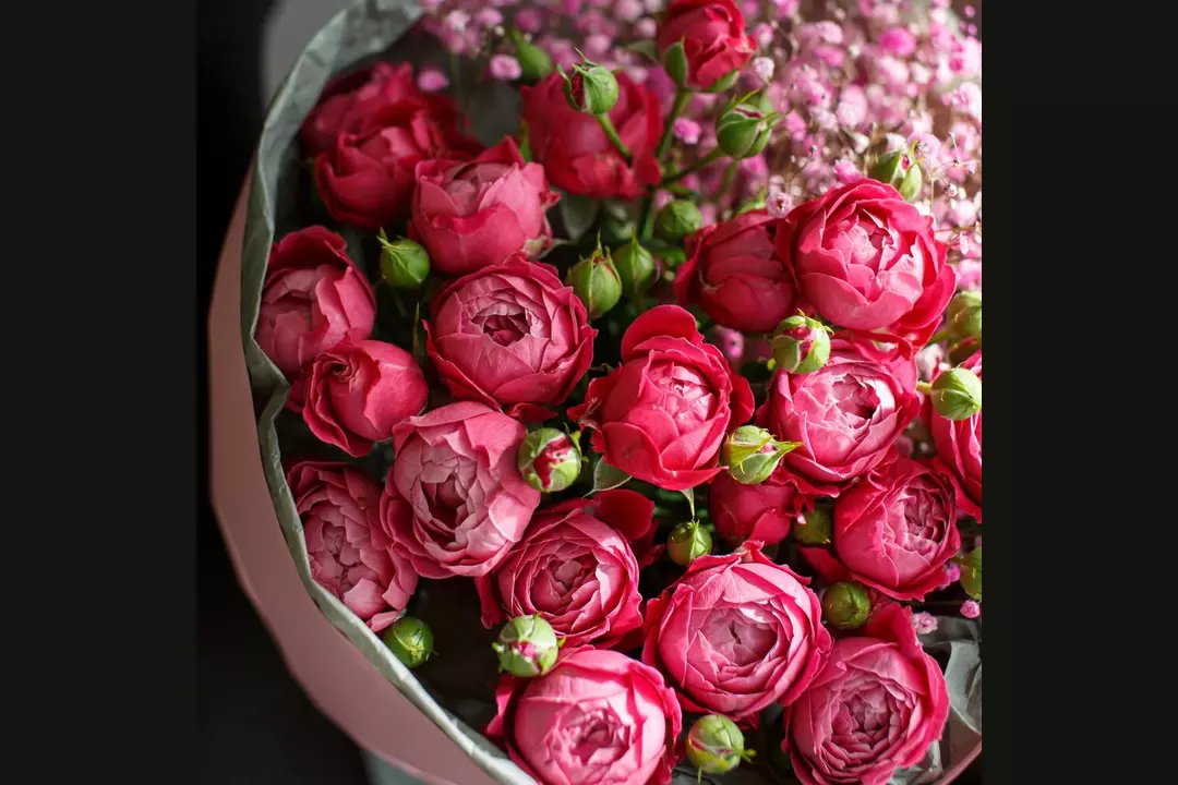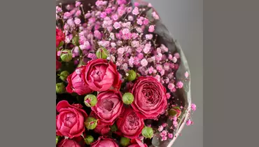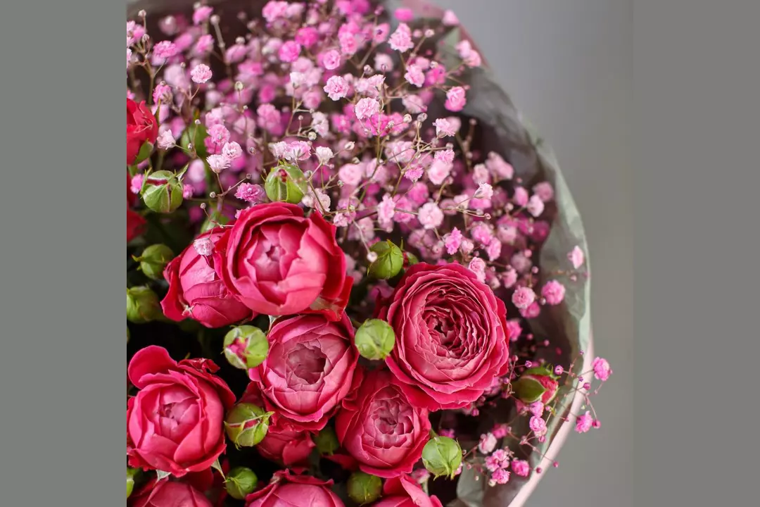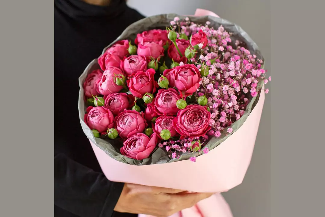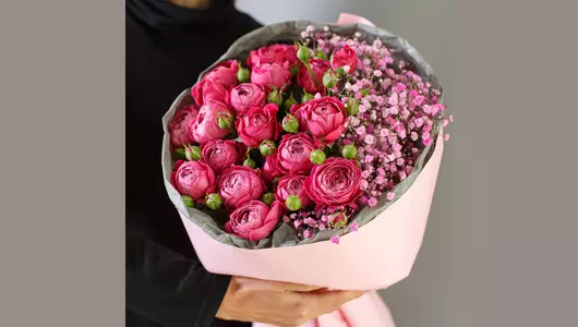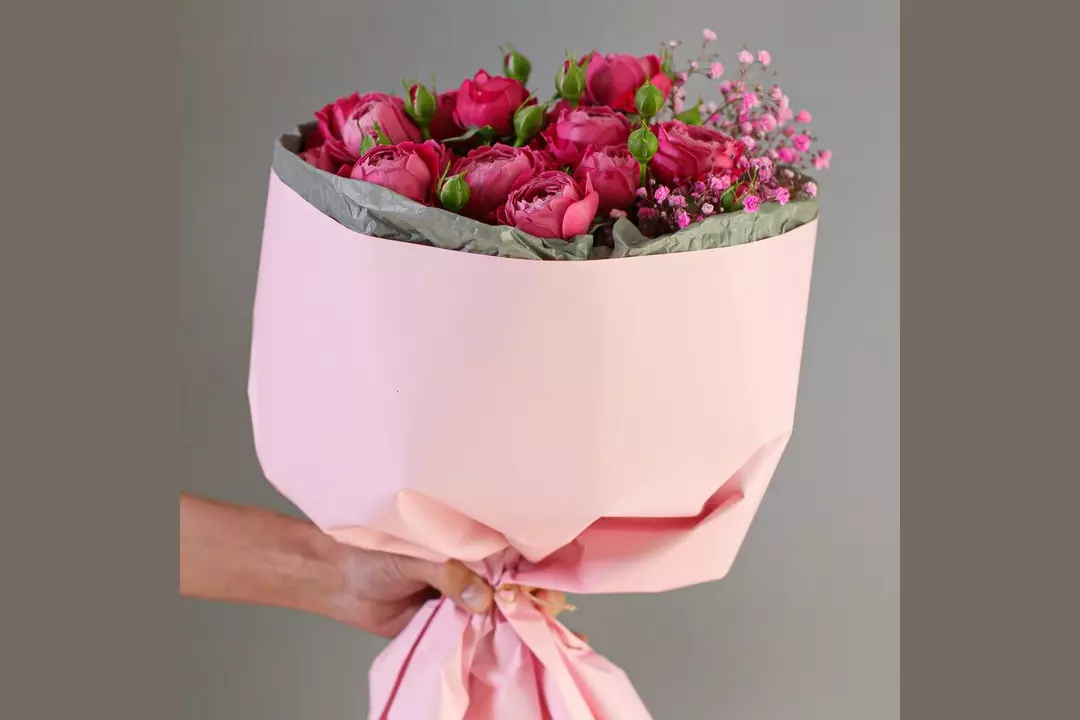 Один из самых популярных букетов у наших клиентов. Волшебные пионовидные кустовые розы Состав: Гипсофила розовая - 2 шт. Корейская пленка - 1 шт. Роза кустовая - 5 шт. Лента - 1 шт