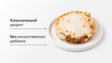 Традиционная греческая запеканка из картофеля с сочным мясным фаршем, сыром и овощами. Состав проверен: нет искусственных красителей, заменителей молочного жира, консервантов и пальмового масла