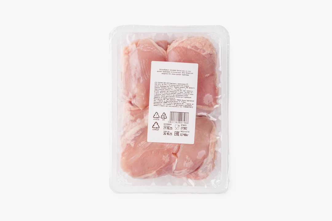 Охлаждённые окорочка без кости и кожи. В этой части тушки достаточно сочности и вкуса, поэтому она подходит для любых блюд. Например, можно потушить с любимым соусом за 25–30 минут. Или отправить в разогретую до 170ºС духовку на 40–50 минут.