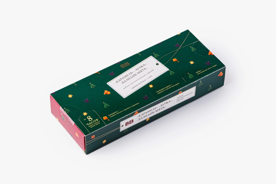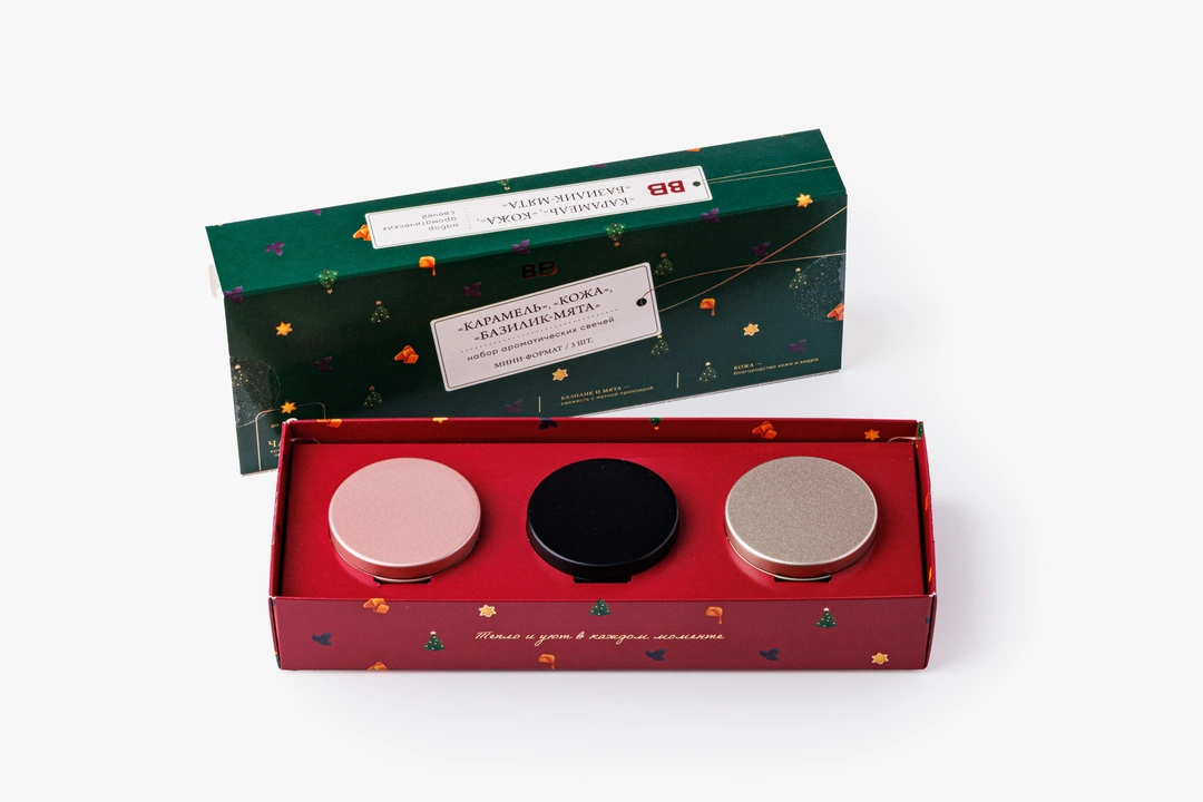 Три мини-свечи на основе соевого воска и парафина с хлопковым фитилём. Ароматы подобраны контрастно: сладость карамели, свежий травяной акцент базилика и мяты, глубокая кожаная нота. Мини-формат позволяет пробовать разные настроения и выбирать аромат под момент.