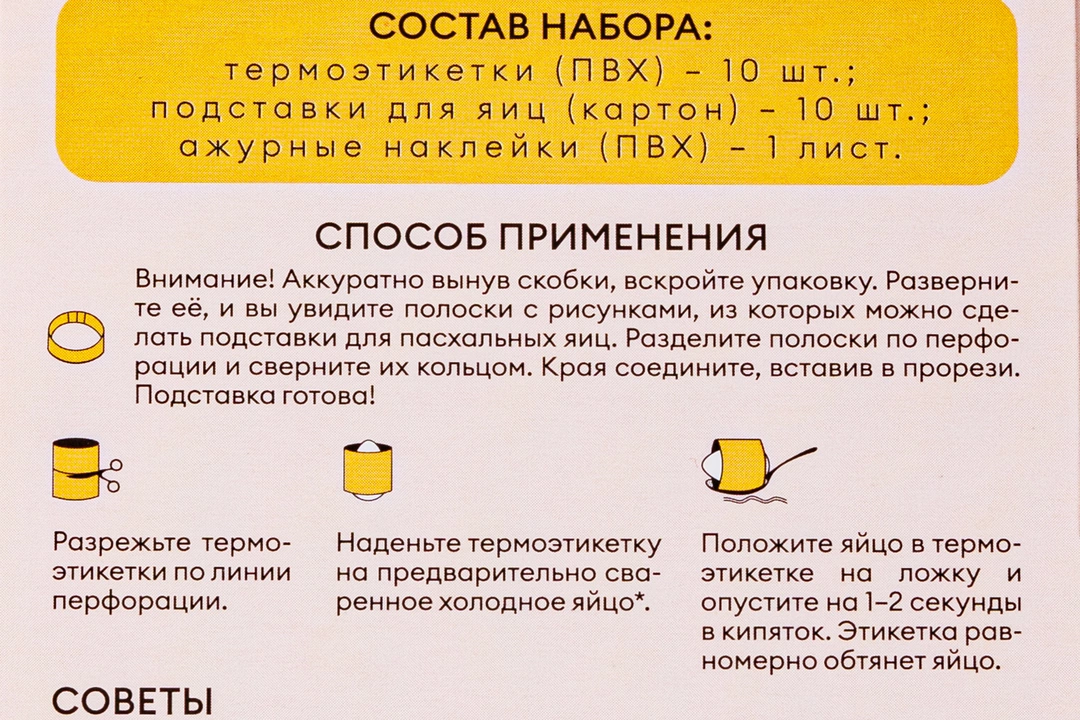 Праздничный набор для украшения пасхальных яиц — всё, что нужно для яркого и нарядного декора. В комплекте 10 термоэтикеток, 10 картонных подставок и лист ажурных наклеек. Просто оберните термоэтикетку вокруг сваренного яйца и на 1-2 секунды опустите в кипяток — плёнка плотно обтянет поверхность. Подставки легко собираются по инструкции и делают сервировку особенно красивой. Подходит для творчества с детьми.