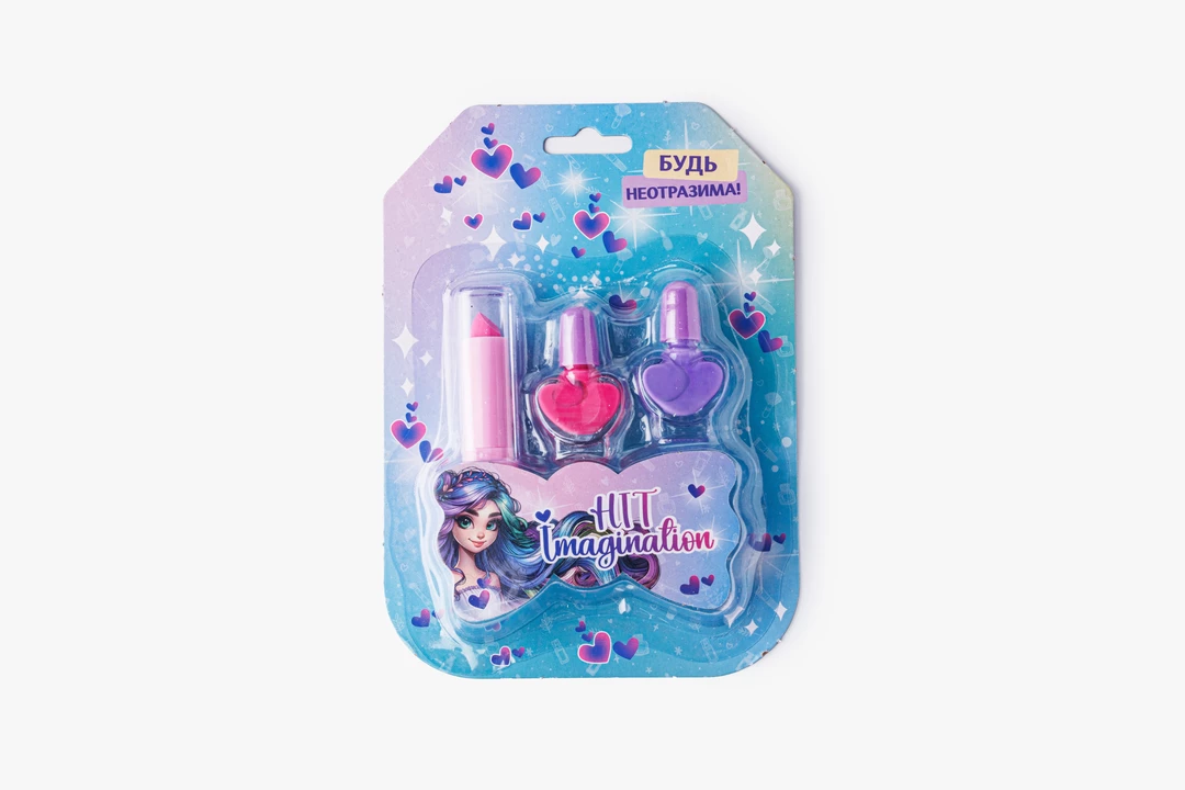 Яркий набор декоративной косметики для детей включает два лака для ногтей и помаду с мягким розовым оттенком. Средства легко наносятся и смываются, не раздражают кожу и безопасны при использовании под присмотром взрослых. С таким набором ребёнок может пробовать разные образы и учиться выражать себя через игру. Косметика помогает ребёнку тренировать фантазию и создавать образы принцессы, феи или супергероини. Набор подходит для детских домашних праздников, творческих занятий и первых экспериментов с макияжем. Рекомендовано детям старше пяти лет.