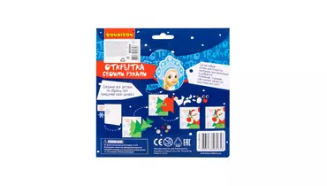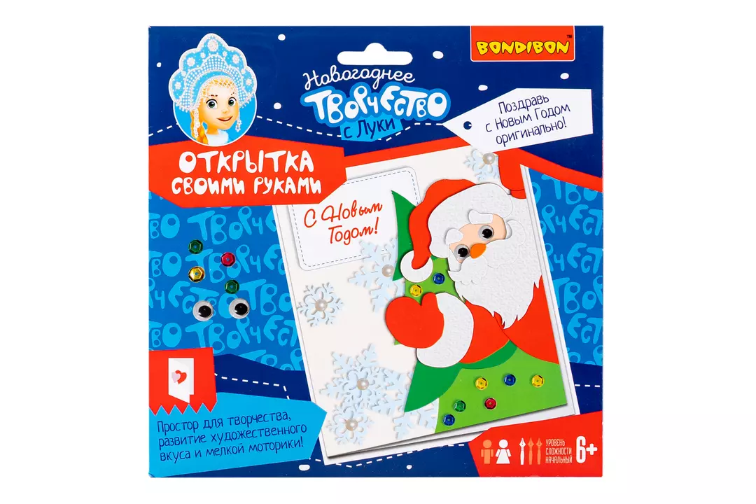 Готовим подарок для мамы, папы, бабушки, дедушки! С набором для творчества НОВОГОДНЯЯ ОТКРЫТКА СВОИМИ РУКАМИ. С НОВЫМ ГОДОМ! Серии Новогоднее творчество с Луки от Bondibon ребенок сможет сам сделать красивую объемную открытку с Дедом Морозом! Приклейте бумажные, пластиковые и тканевые элементы к основе при помощи двустороннего скотча. Можно соединить детали по образцу или придумать свой дизайн. Красочная аппликация готова! Осталось подписать открытку и вручить ее адресату! Оригинальную поделку можно также отнести на конкурс в детский сад, школу. Набор для творчества НОВОГОДНЯЯ ОТКРЫТКА СВОИМИ РУКАМИ. С НОВЫМ ГОДОМ! от Бондибон развивает мелкую моторику, аккуратность, зрительное восприятие, художественный вкус и гарантирует праздничное настроение! В набор входят: основа для открытки, материалы для аппликации, украшения, двусторонний скотч. Возраст 6+ Страна-производитель КИТАЙ