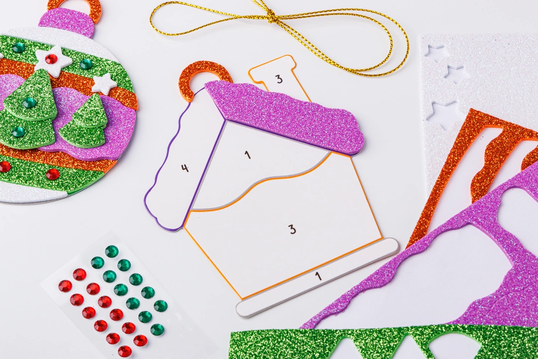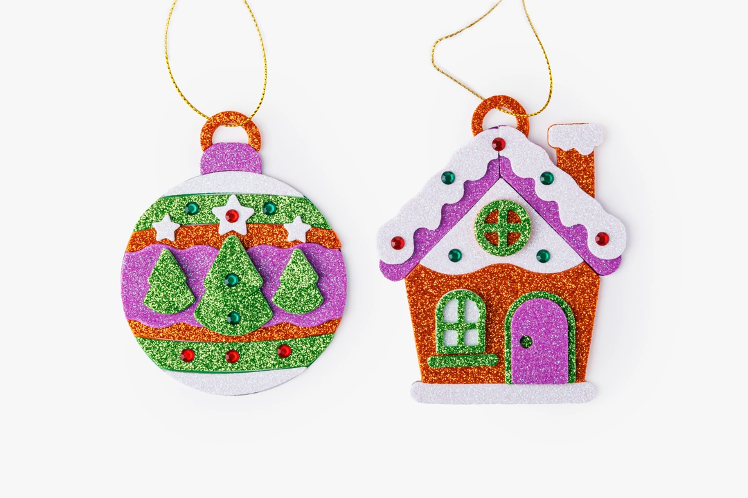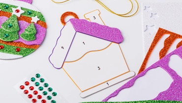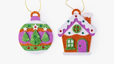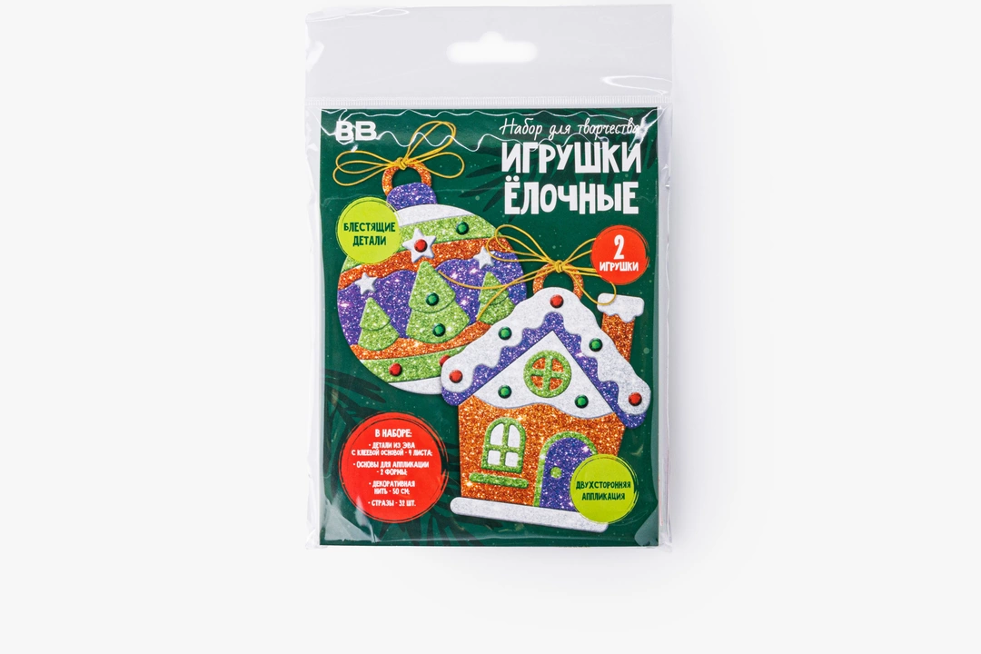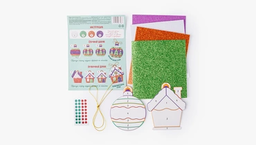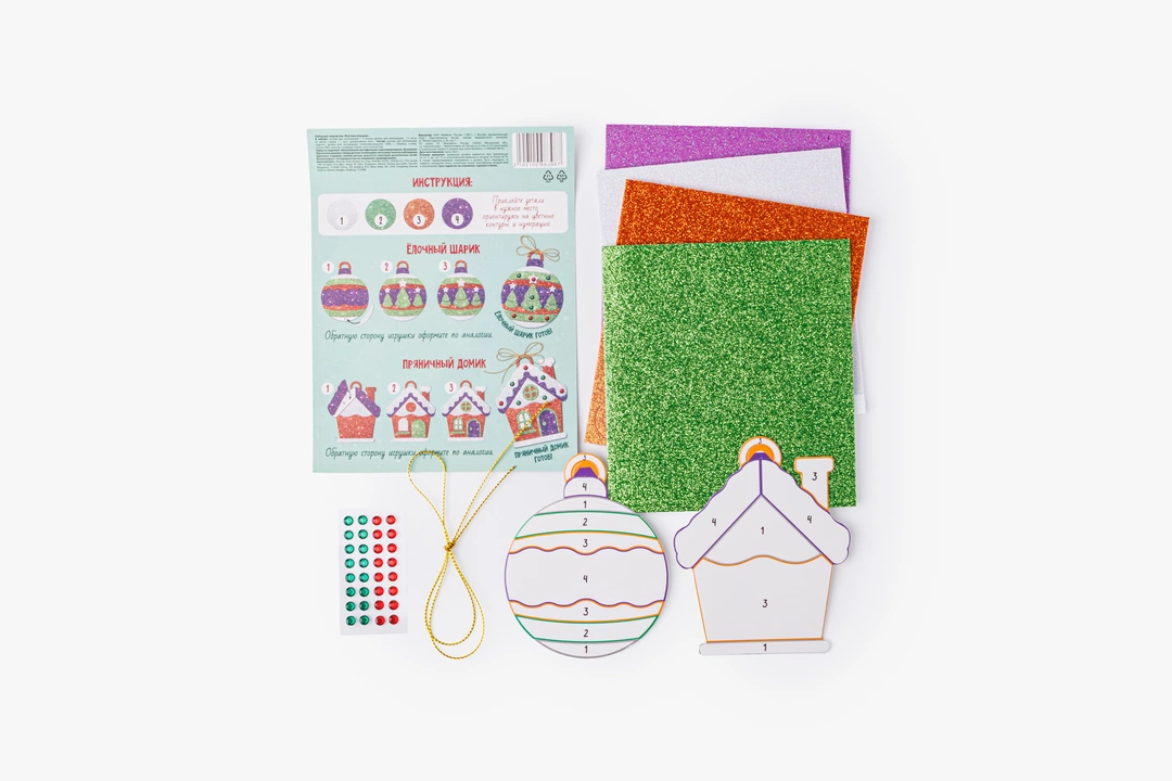 В наборе собраны материалы, из которых можно смастерить две яркие ёлочные игрушки: шар и пряничный домик. Детали нужно приклеить по цветным контурам, добавив стразы и декоративную нить. Каждая игрушка получается двусторонней, поэтому её удобно повесить на ёлку или украсить комнату. Простая схема сборки помогает разобраться самостоятельно, а процесс развивает усидчивость, мелкую моторику и чувство композиции.