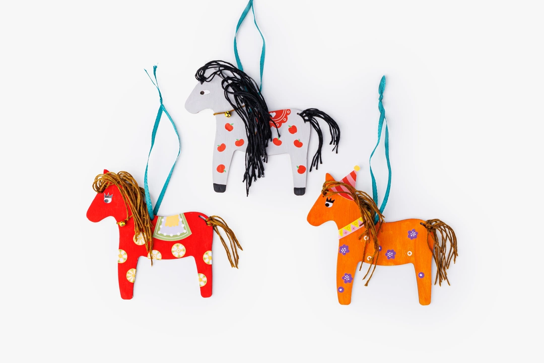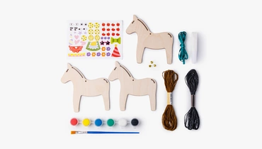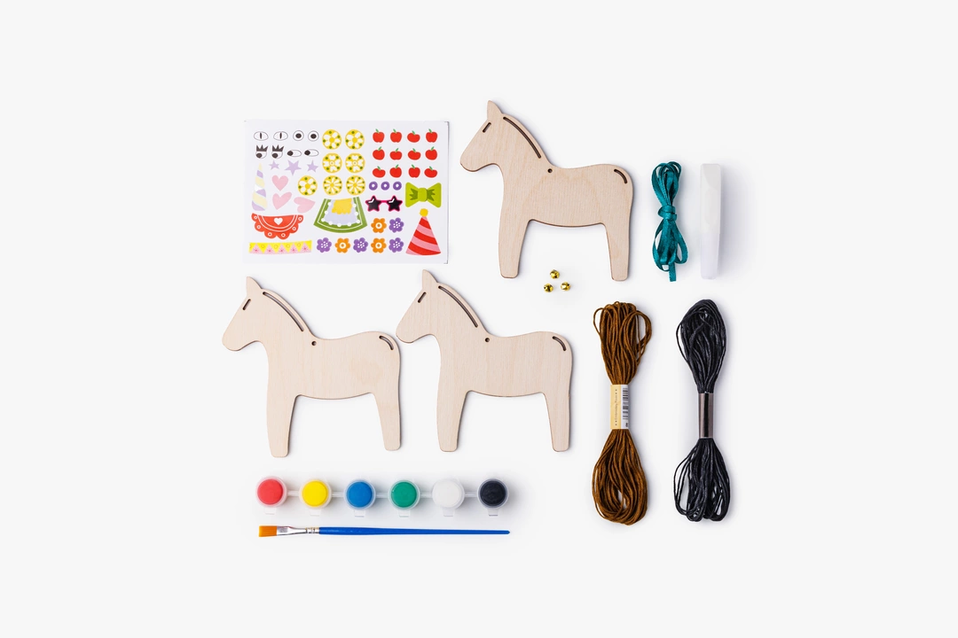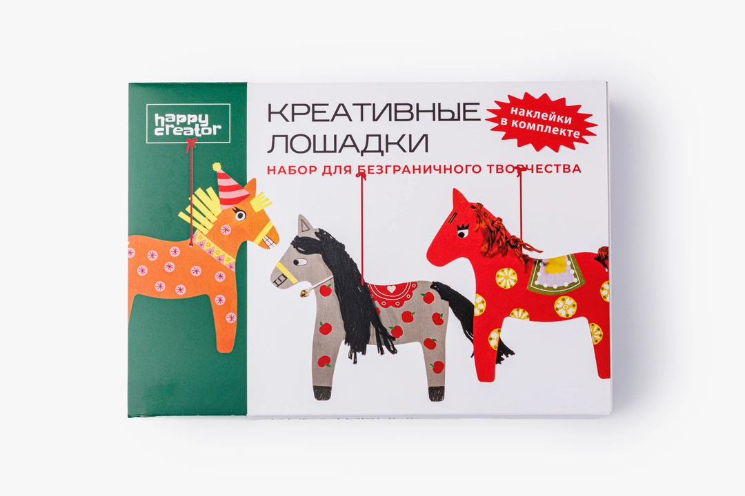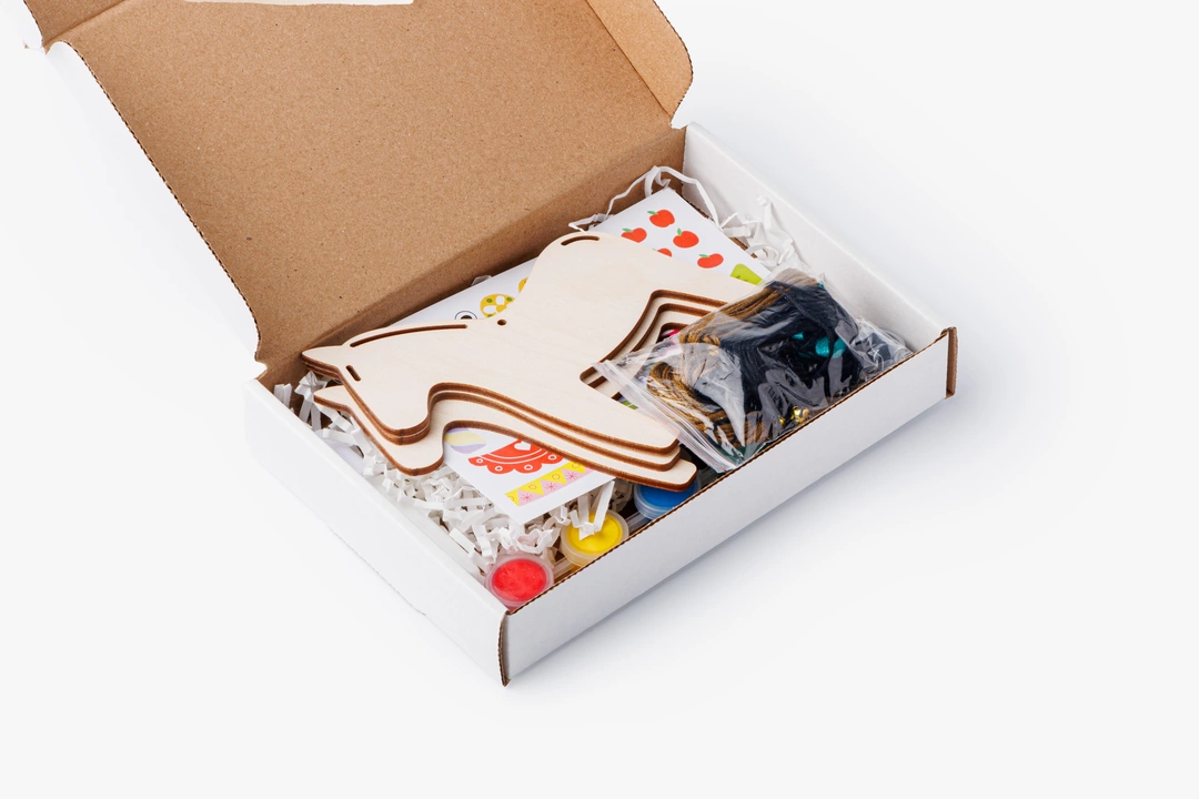 Набор для творчества поможет детям создать трёх разноцветных лошадок и украсить их по своему вкусу. Внутри — деревянные фигурки, акриловые краски с кисточкой, клей, разноцветные нитки, ленты и лист с наклейками. Можно нарисовать узоры, приклеить украшения и добавить гриву из ниток. Такой набор развивает фантазию, мелкую моторику и чувство цвета, а готовые фигурки можно использовать как украшение или в качестве трогательного подарка.